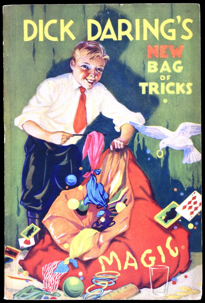 "Dick Daring's New Bag of Tricks Featuring Quaker Puffed Wheat and Puffed Rice." Pictorial full-color printed wrappers, copiously illustrated, 64 pages. Mild wear to edges, some darkening to covers. Ownership notation and signature inside front cover. Good.