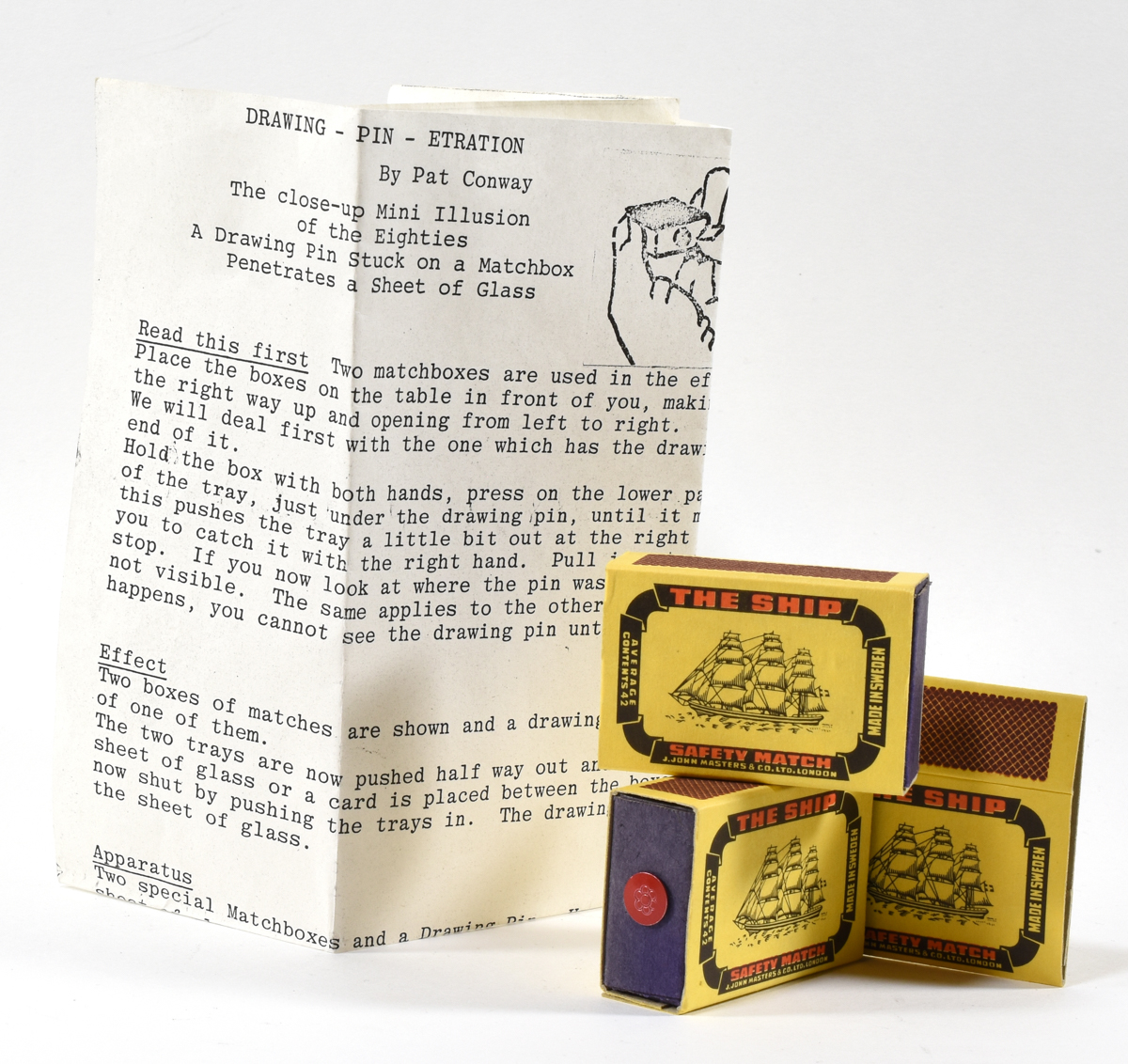 Two match boxes are shown and a drawing pin is pushed into the end of one of them. The two trays are now pushed halfway out and turned end to end with a sheet of glass blaced between. The boxes are shut by pushing the trays in and the pin is seen to penetrate the sheet of glass. Includes two match boxes, two covers (one folded), a short pin, and the instructions for the effect. Very good.