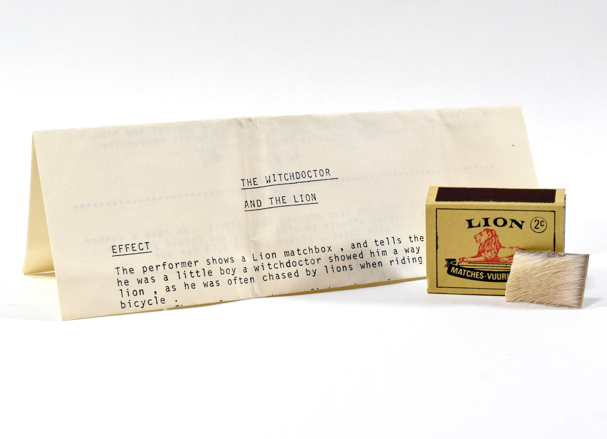 Includes a gimmicked matchbox, piece of "lion skin" (small piece of hide), and original instructions. The performer changes a matchbox cover into a piece of "lion skin" and then back again, accompanied by a story of a lion chase. Very good condition.