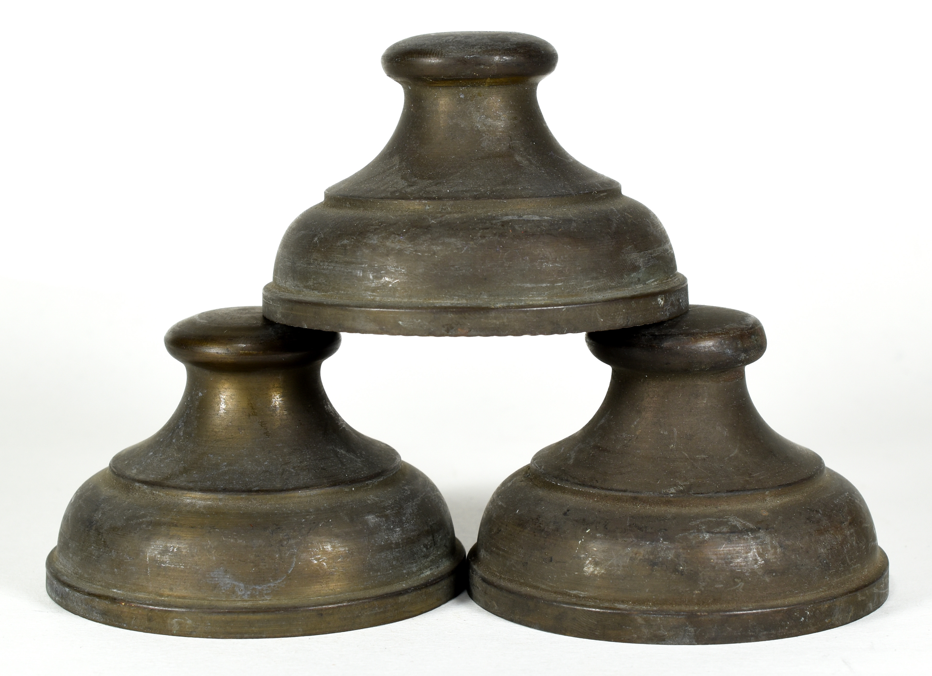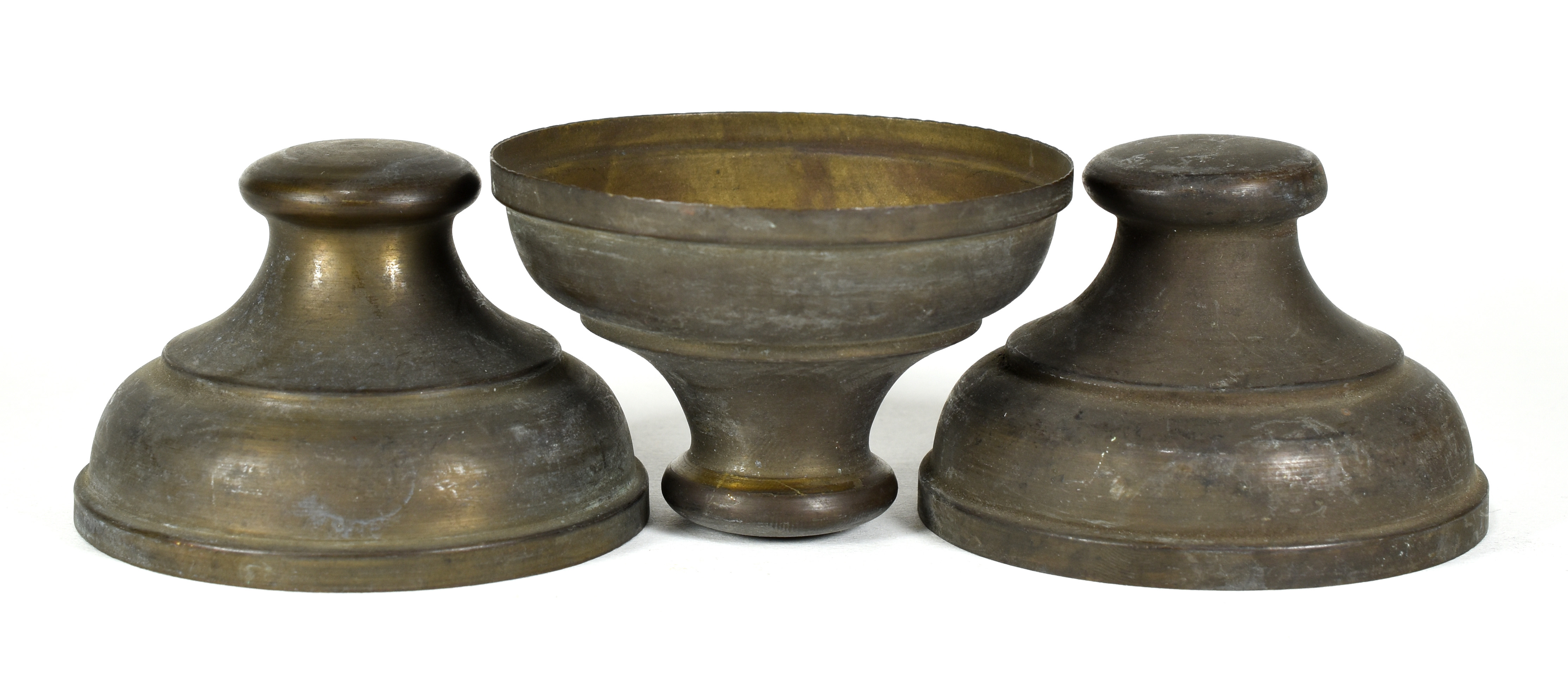 Indian-style cups for the classic cups and balls routine, with small handles at the top. The handle on this set is a bit bigger than other examples. This set has a nice, aged-metal petina.