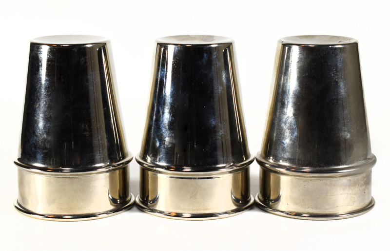 In the P and L style, though without hallmark, these are spun copper cups with chrome plating. Some wear and oxidation internally, areas of exteriors could use some polish. Good condition.