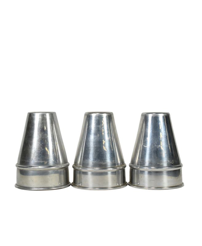 Set of three large cups, each with the ability to hold a liquid load. Likely made of chrome-plated aluminum. Some scuffing and wear, good condition.