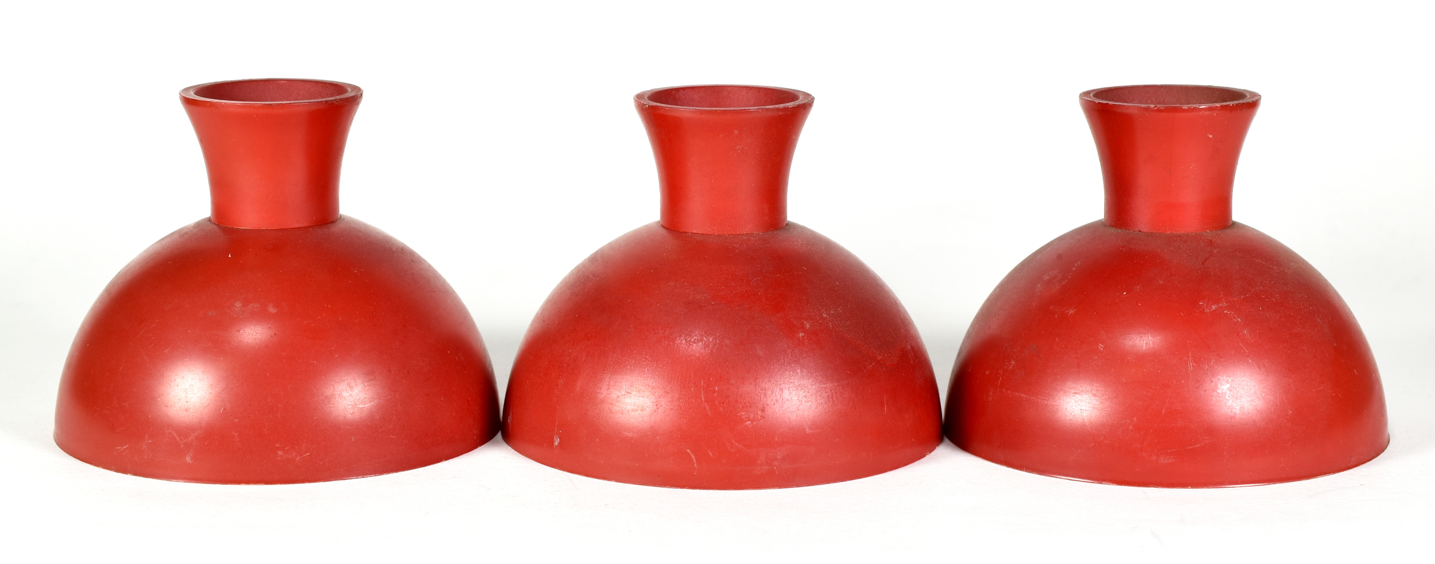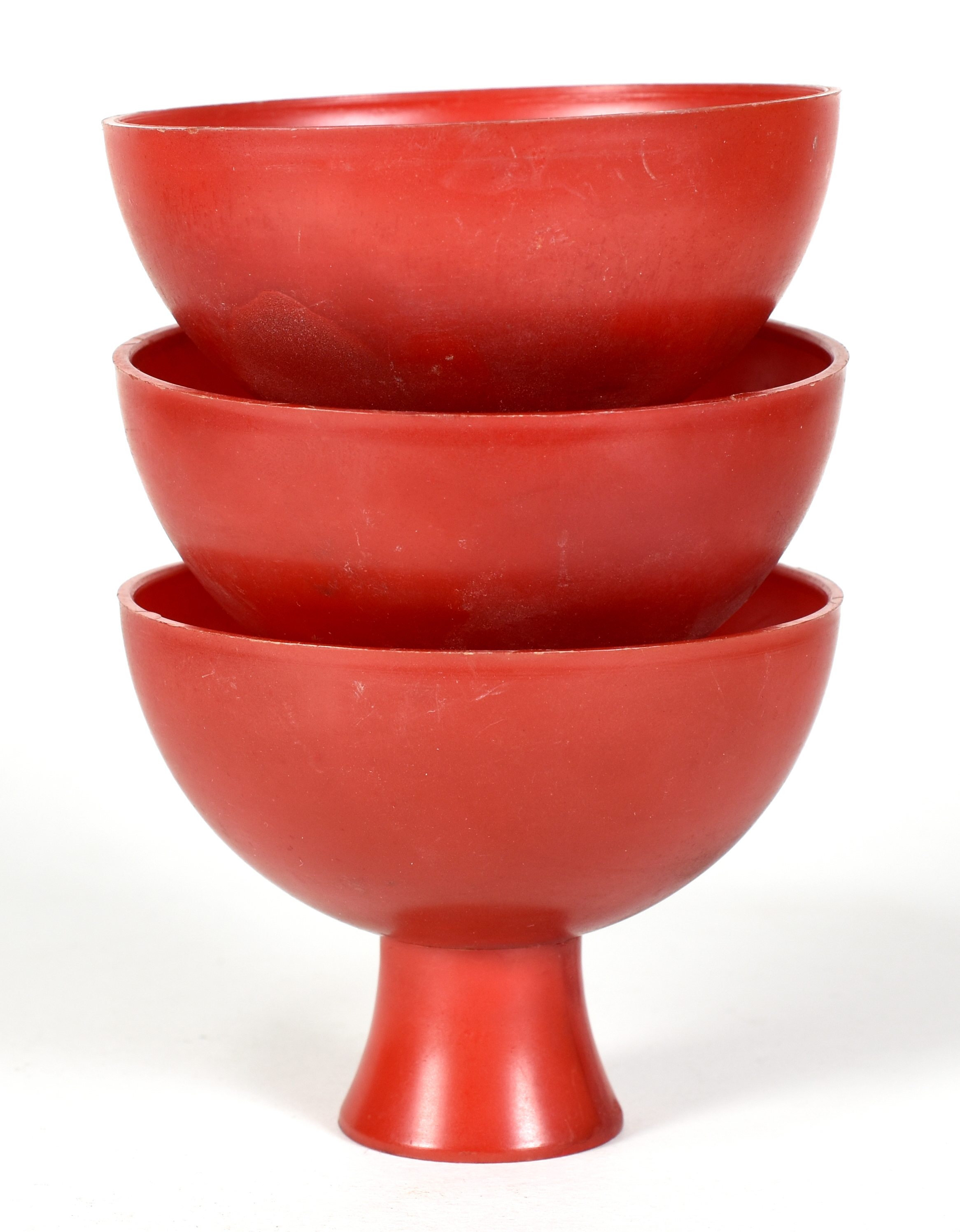 Red plastic Indian-style cups with cork in handles. Color darkening with age, some soiling and scratching. Good condition overall.