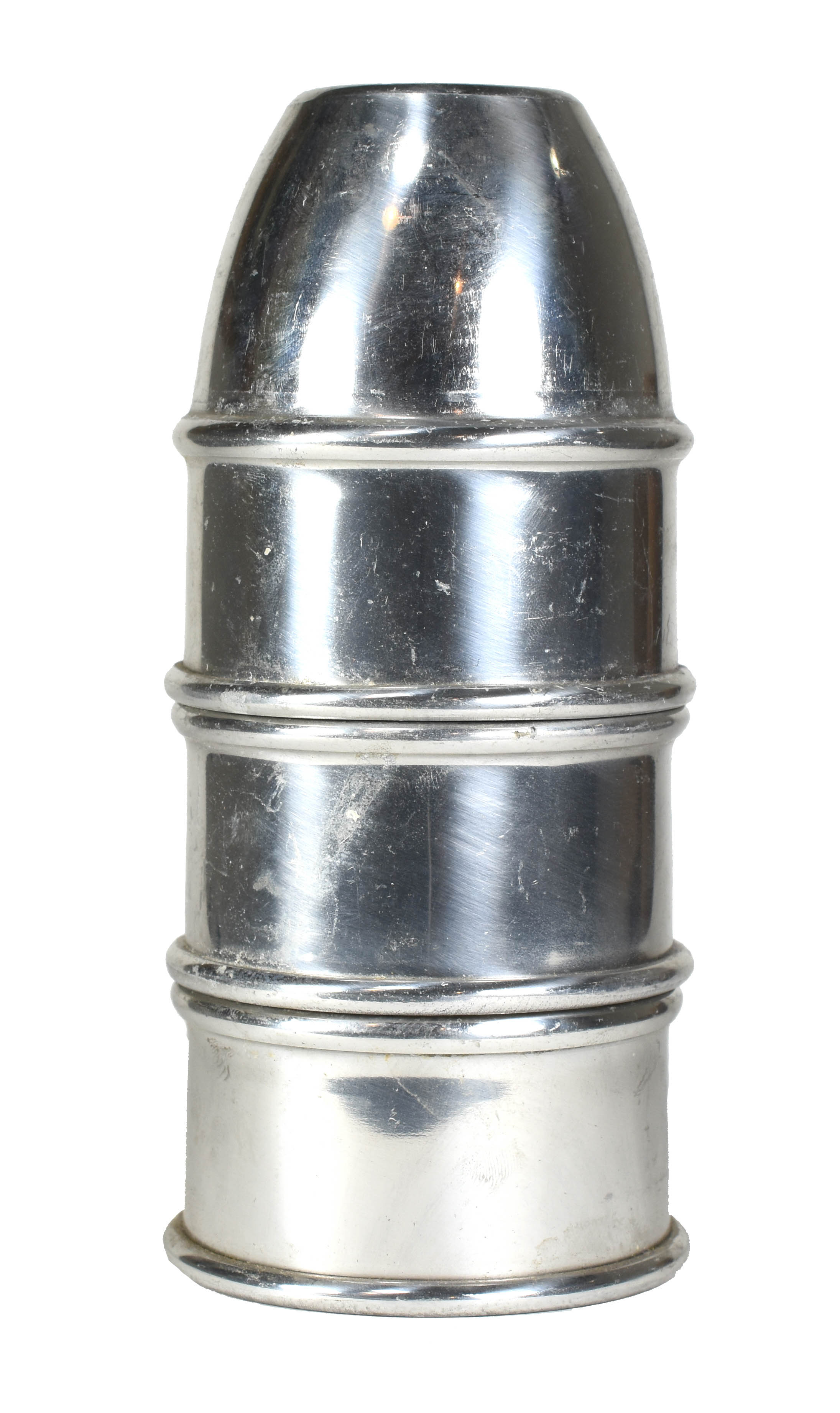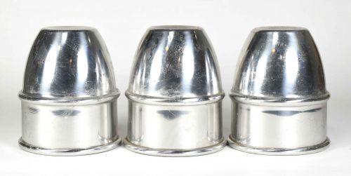 Set of three spun aluminum, chrome-plated cups with single bead shoulders. Previous owner notes these cups were produced and purchased in Canada. Some soiling and scratches, wear from use. Good condition.