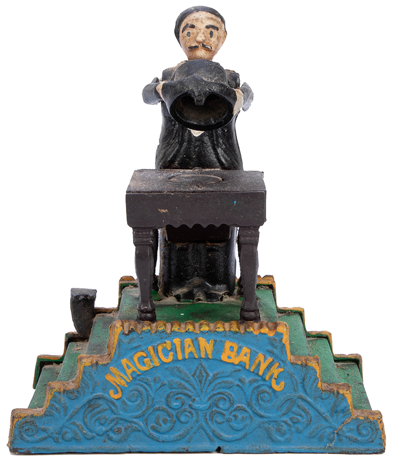 Vintage magician mechanical bank. Heavyweight, made of cast iron and modeled on the Stephens original. Soiling and wear, else in good condition.