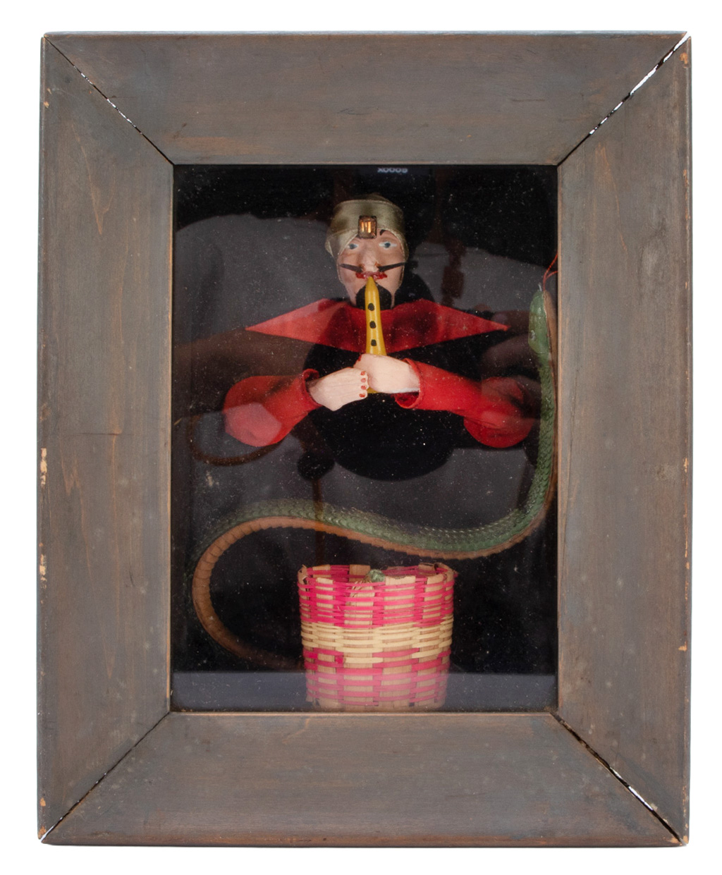 Snake charmer diorama with a hook at the bottom of the box to move the tail of the snake in the basket up and down. Some soiling, else in good condition.