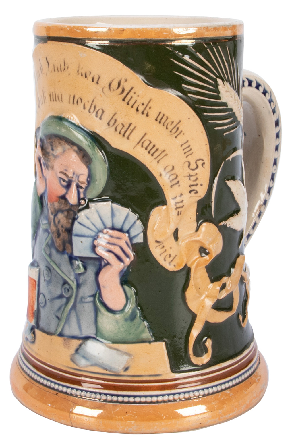 Vintage German decorative stoneware beer mug of a man playing cards. Very good condition.