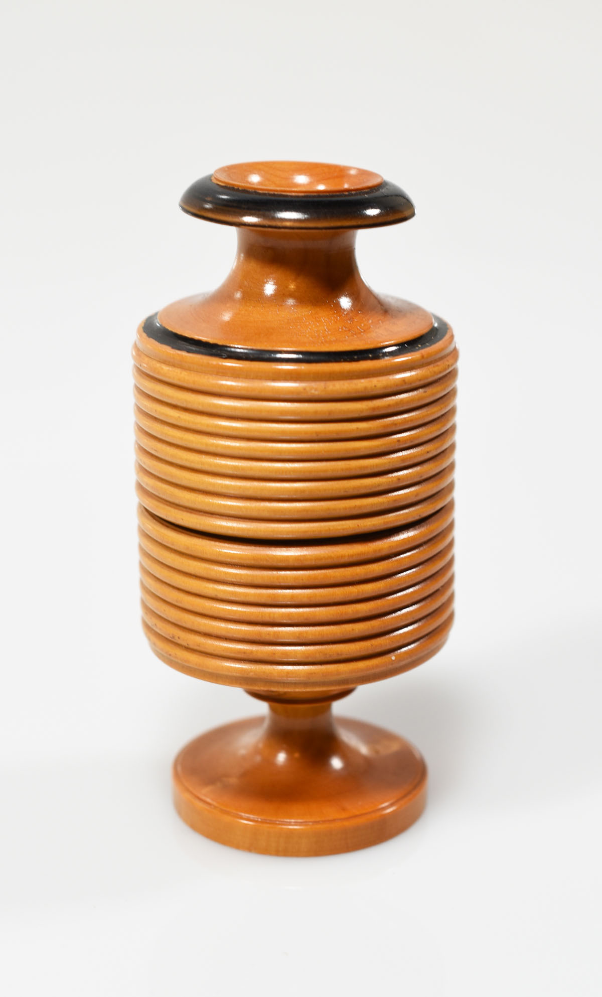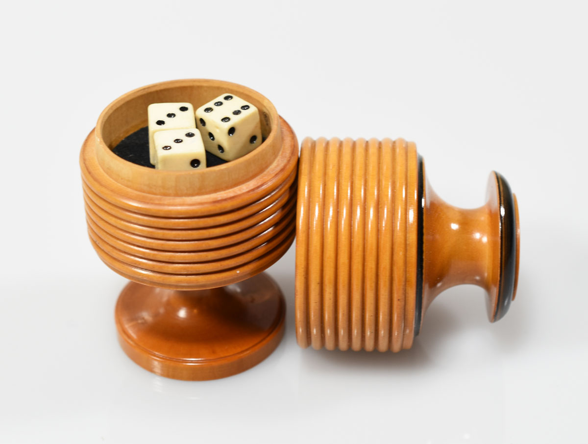 Small, turned wood dice vase with three dice, black painted details. Interior with felt lining. Excellent condition.
