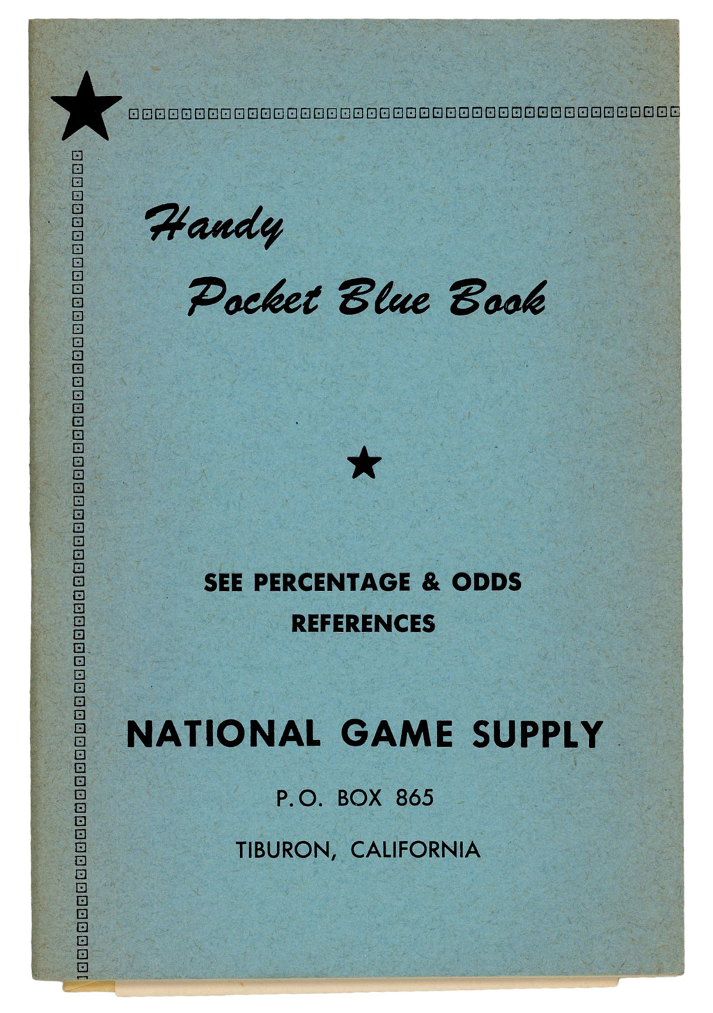 Blue wrappers, illustrated, 21 pages. A trade catalog of gambling supplies, poker chips, dice, cards, etc. Mild toning, else in very good condition.