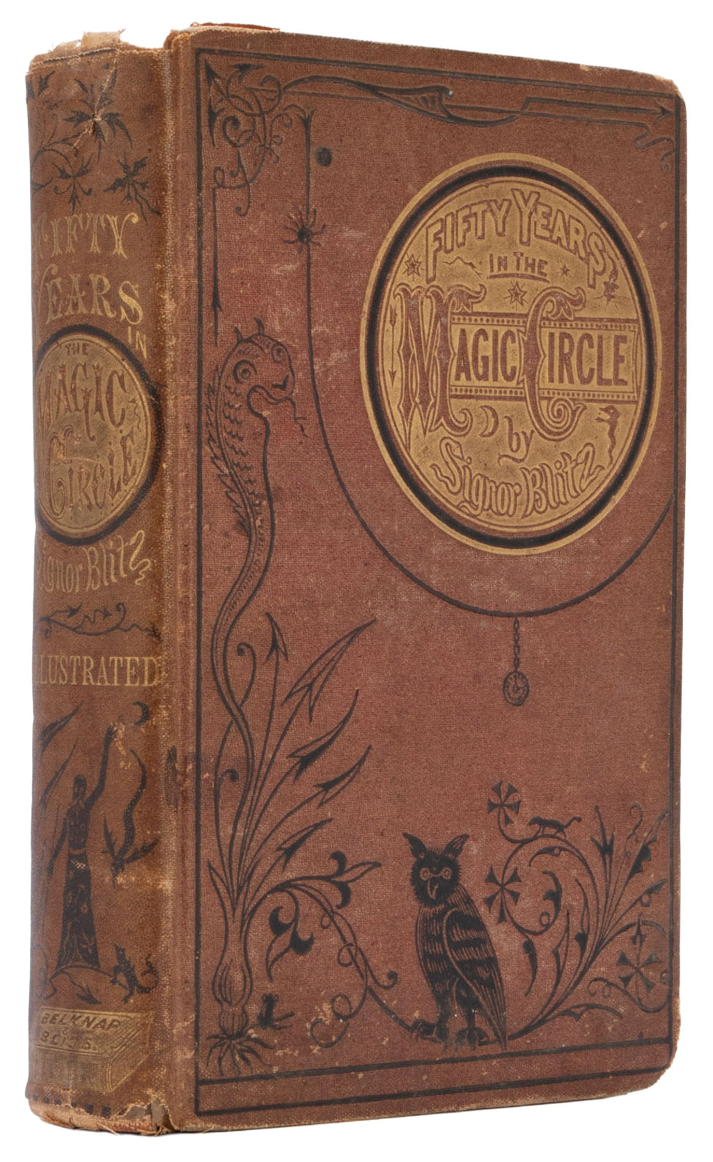 Fifty Years in the Magic Circle; Being an Account of the Author's Professional Life: His Wonderful Tricks and Feats; with Laughable Incidents, and Adventures as a Magician, Necromancer, and Ventriloquist. Brown cloth with black and gilt stamping on front cover and spine. Engraved frontispiece, illustrated with engravings, 432 pages with two leaves adverts at rear. Corners and spine bumped and chipped, toning to page edges, air pockets to covers, pencil and pen markings to front free end paper, hinges loose, poor condition.