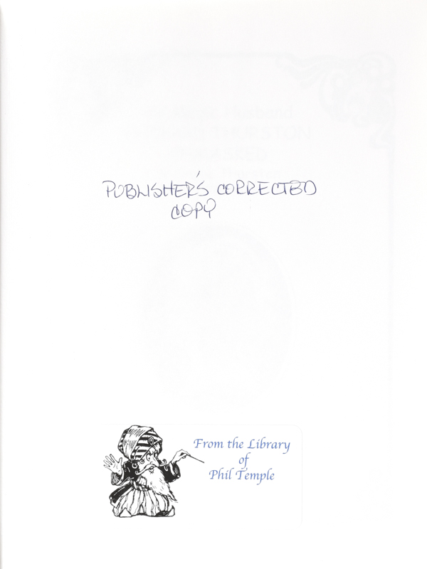My Magic Husband, Howard Thurstron Unmasked by Grace Thurston as told to William L. Rohde with the additional historical recollection of Charles Holzmueller. Deep blue navy hard cover with gilt lettering in original portrait dust jacket. Publisher's corrected copy, signed by the publisher with notations in text, 190 pages. Mild shelf wear to jacket, else very good.