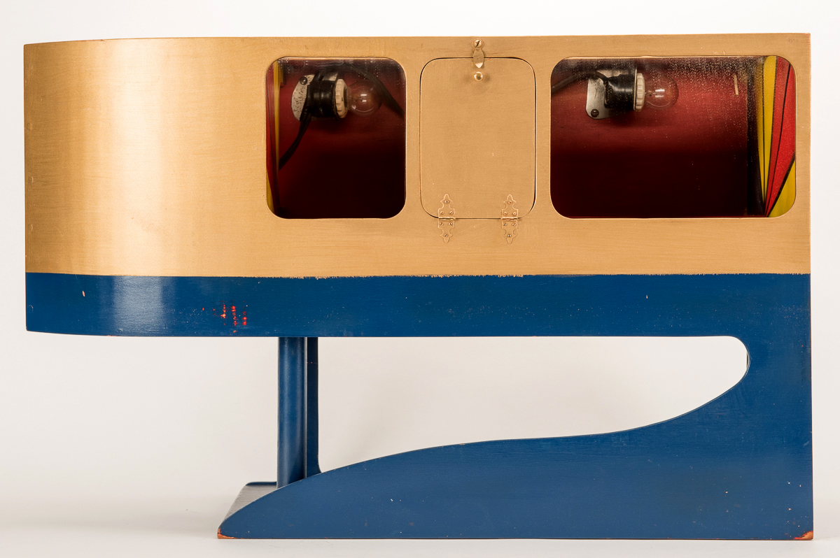 An audience volunteer places his arm in a wooden cabinet and two blades are pushed through the box. When doors are opened in the front and back of the cabinet, the center of the arm has vanished. Lacking blades. With original packing case (lock broken). Incurs extra shipping charges due to size and weight. Please inquire before purchasing.