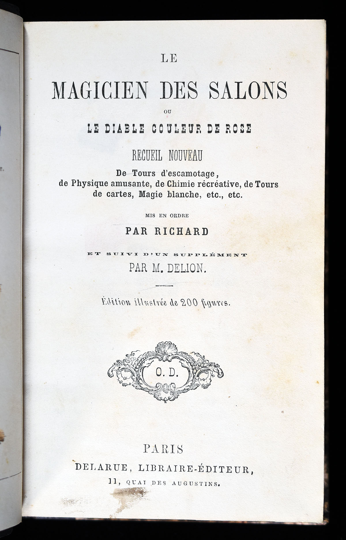 "Le Magicien des Salons, Ou, le Diable Couleur de Rose." Quarter brown leather with patterned boards, raised spine with gilt lettering and decoration in compartments. Hand-colored engraved frontispiece, illustrated. 378 pgs with 10 pgs of adverts at back. Some mild marking and spotting on a few pages including frontispiece, Bottom left corner torn pg. 120, else very good. Ex Libris Comte de Lusignan. French.