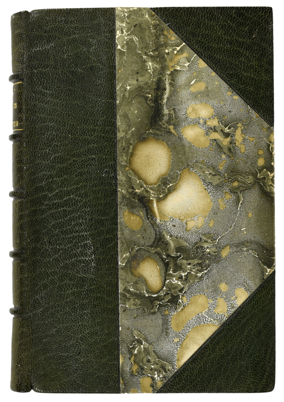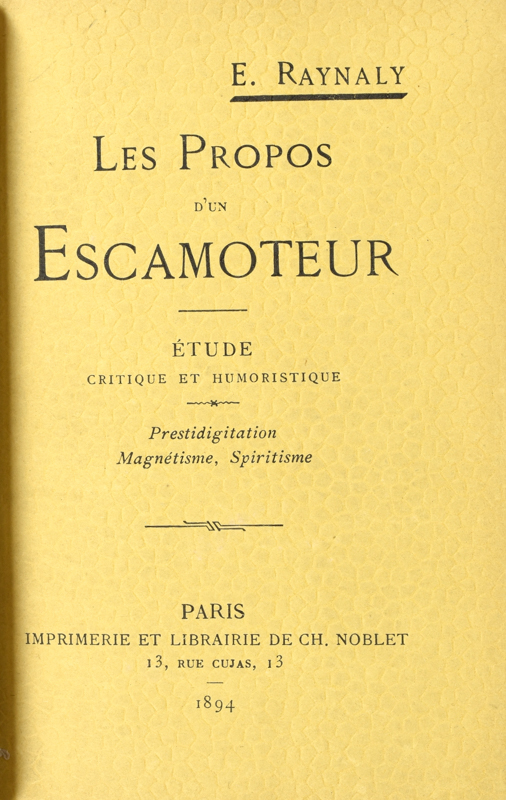 Les Propos d'un Escamoteur: Etude Critique et Humoriste; Prestidigitation, Magnetisme, Spiritisme. Custom fine binding. Three quarters green leather over marbled boards, raised spine with gilt lettering. Retaining orignal textured yellow wrappers, with portrait frontispiece, 242 pages. Light soiling and toning to binding, else in very good condition.