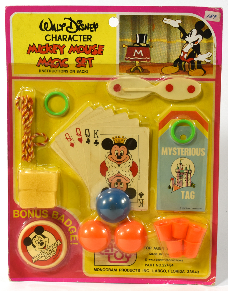 Complete magic set in original packaging with bonus Mickey Mouse Club badge. Instructions on back. Packaging soiled and slightly warped but in good condition, unopened.