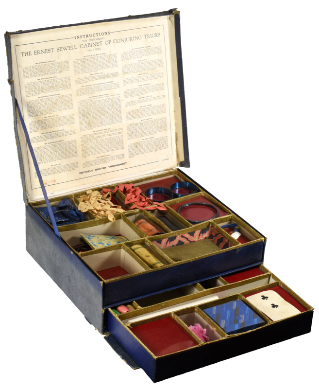 The Ernest Sewell Cabinet of Conjuring Tricks, No. 4 Size. A beautiful two-drawer set of small magic apparatus, including tricks made out of metal, paper, and ribbon. Missing a few tricks (see photographs), however, apparatus present are in good to very good condition. Box with age-consistent wear, tears, and soiling. Generally good to very good.