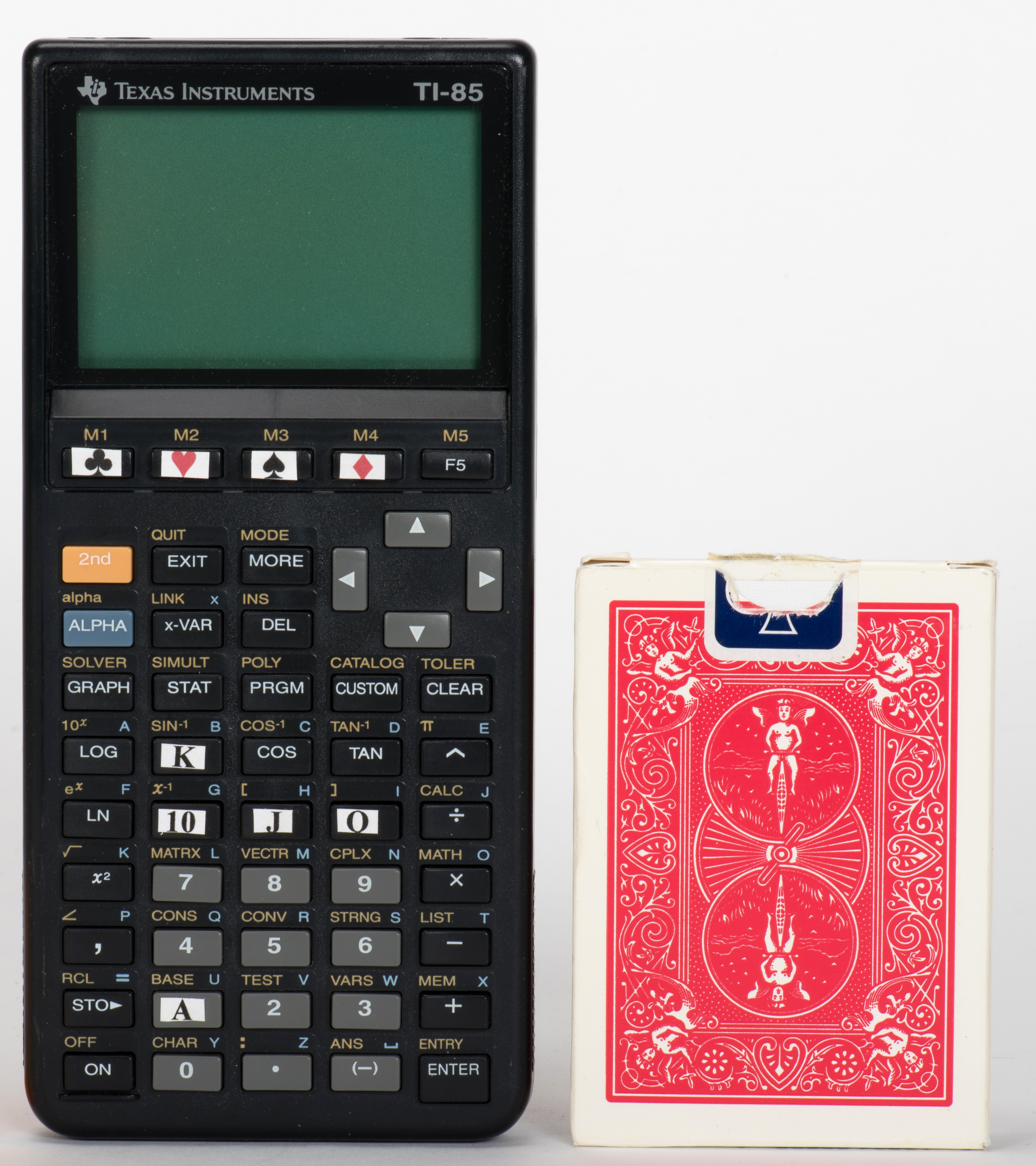 A repurposed Texas Instrusments special poker calculator is shown and turned on. It has suit and value keys so a card can be entered and displayed. Five cards are freely chosen from a borrowed deck. A spectator removes one of the cards and places it in his pocket. He does not know the identity of the card. Next, he enters the remaining four cards into the calculator. After the four cards are entered, a graphic representation of another card appears onscreen. The spectator removes the card in his pocket, matching the one just shown on the calculator. Bagged with instruction folder, deck of cards, and calculator.