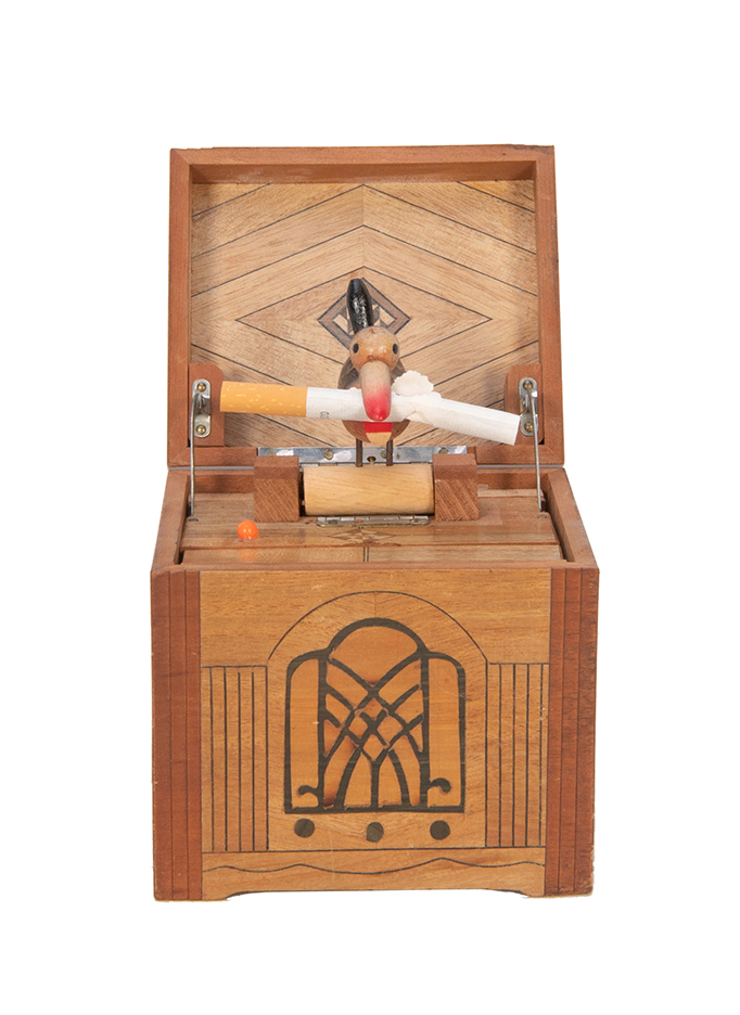 Wooden mechanical cigarette dispenser made in Japan. Constructed of wood veneers with intricate inlay work. The small duck dives downward and picks up a cigarette when the lid of the box is lifted. Works fine. A few chips to veneer, else in very good condition.