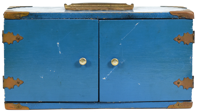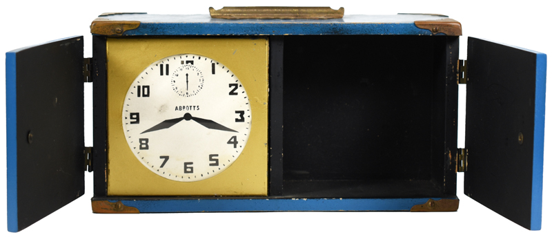Wooden box from which a clock vanishes, only to reappear elsewhere. With a shell and solid clock. Scratches to surface, else in good condition.