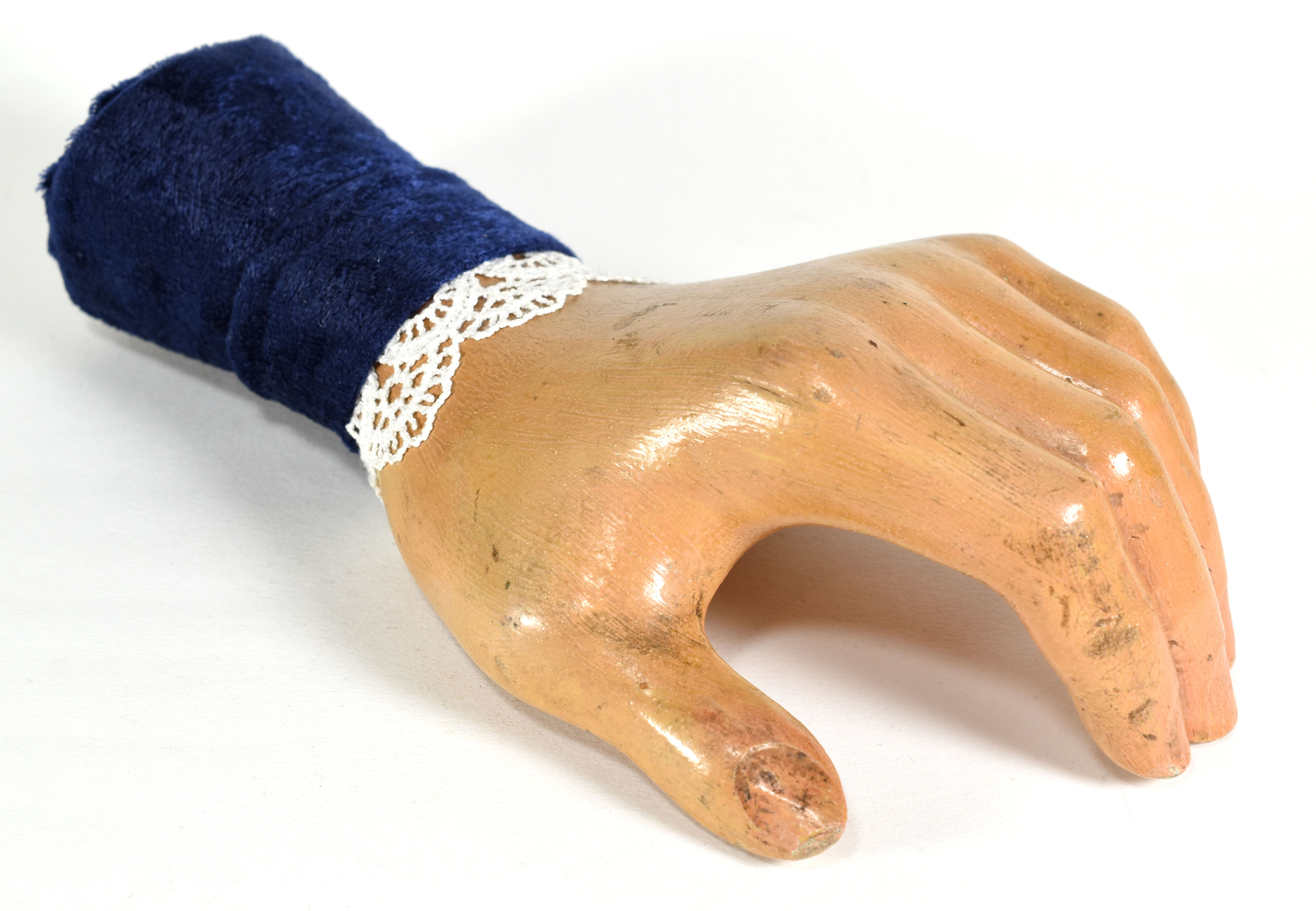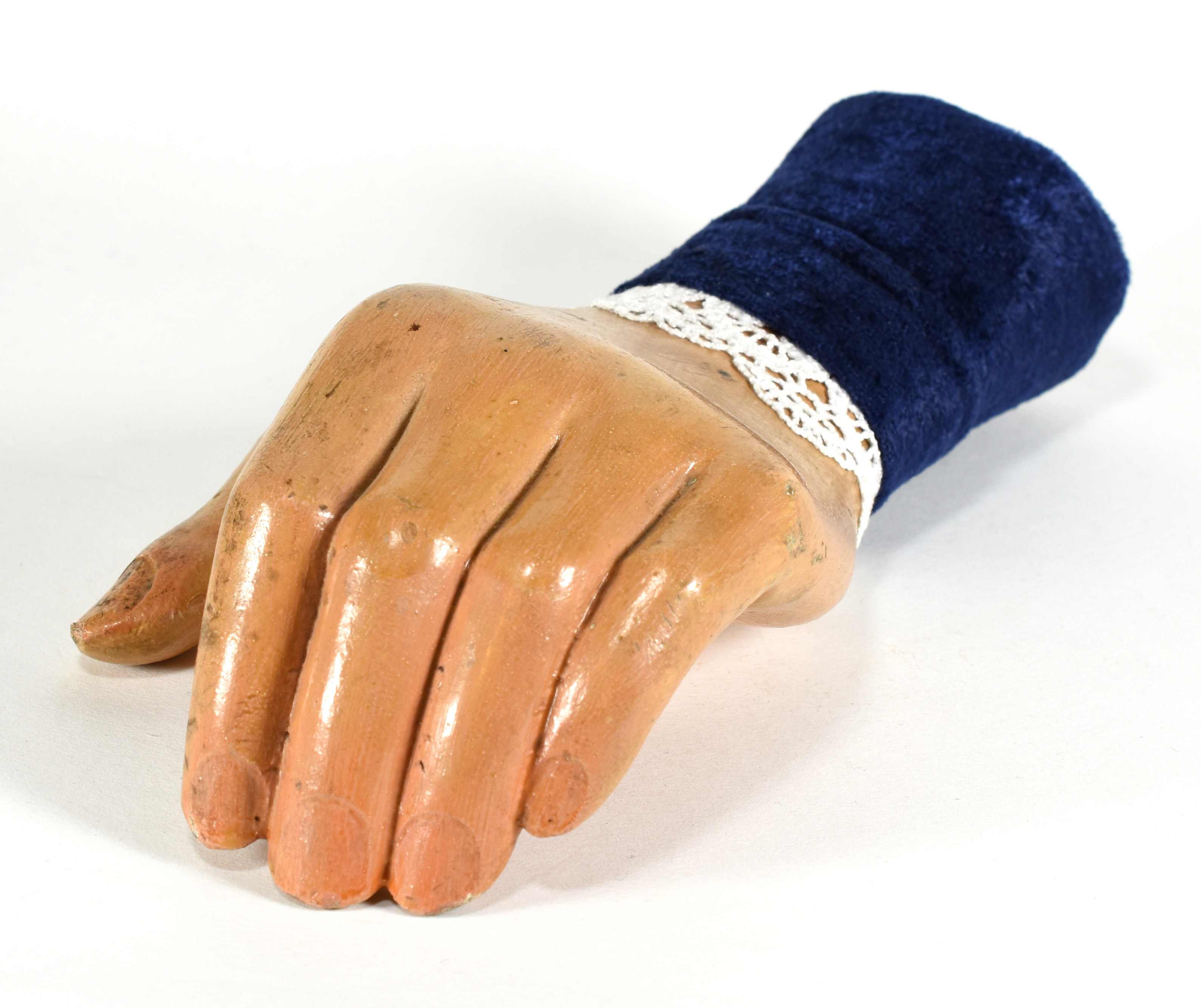 Painted wood rapping hand, weighted to tap out answers to the magician's questions. A bit more curled than usual examples of this apparatus, the nail beds have been lightly tinted pink. Modern velvet cuff, handsewn and removable with small clasps along seam. Wear to paint, particularly on palm; some discoloration and soiling. Good condition.