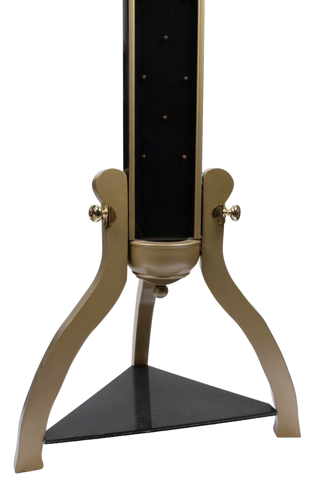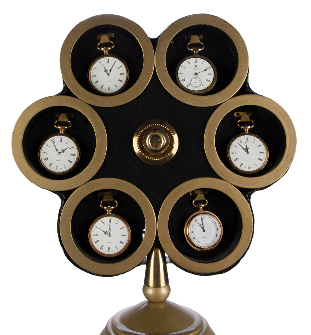 Six pocket watches are produced at the magician’s fingertips. Each is placed in a holder at the top of an elegant stand. Then, one at a time, the watches vanish from the display and cascade down the front of the stand, clacking back-and-forth, as if walking down the rungs of a ladder. They fall into a brass top hat below the stand. For a finale, the performer reaches into the hat and produces a ringing alarm clock. Dimensions.” Hallmarked. Original instructions. Modeled on the Watch Ladder, conceived and constructed by Jesse Thornton for Abbott’s Magic in the 1940s, a prop so rare that only two or three are known to exist. This model, a mechanical masterpiece, is Nick Ruggiero’s version operated mechanically (but not electronically), via a variety of coordinated mechanisms concealed in the “star” at the top of the stand and just above the glass-front ladder. One of less than 12 units manufactured. Very good condition, and essentially as-new condition.