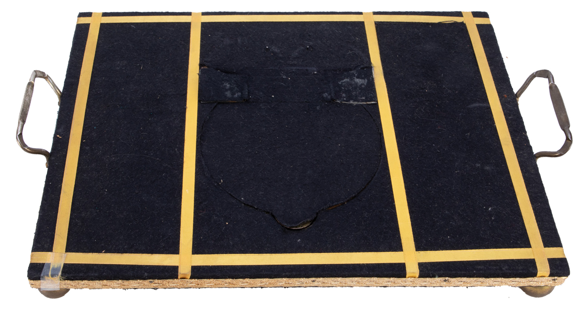 A ringing clock covered by a cloth is lifted from a tray. A final glimpse of the clock is given, then the cloth is thrown in the air; the clock has vanished. No cloth; tray with gimmicked clock only. One of the legs replaced with a short screw, tape in the corner. Sold as-is, but in working and displayable condition. Ususal minor wear and soiling, else in good condition.