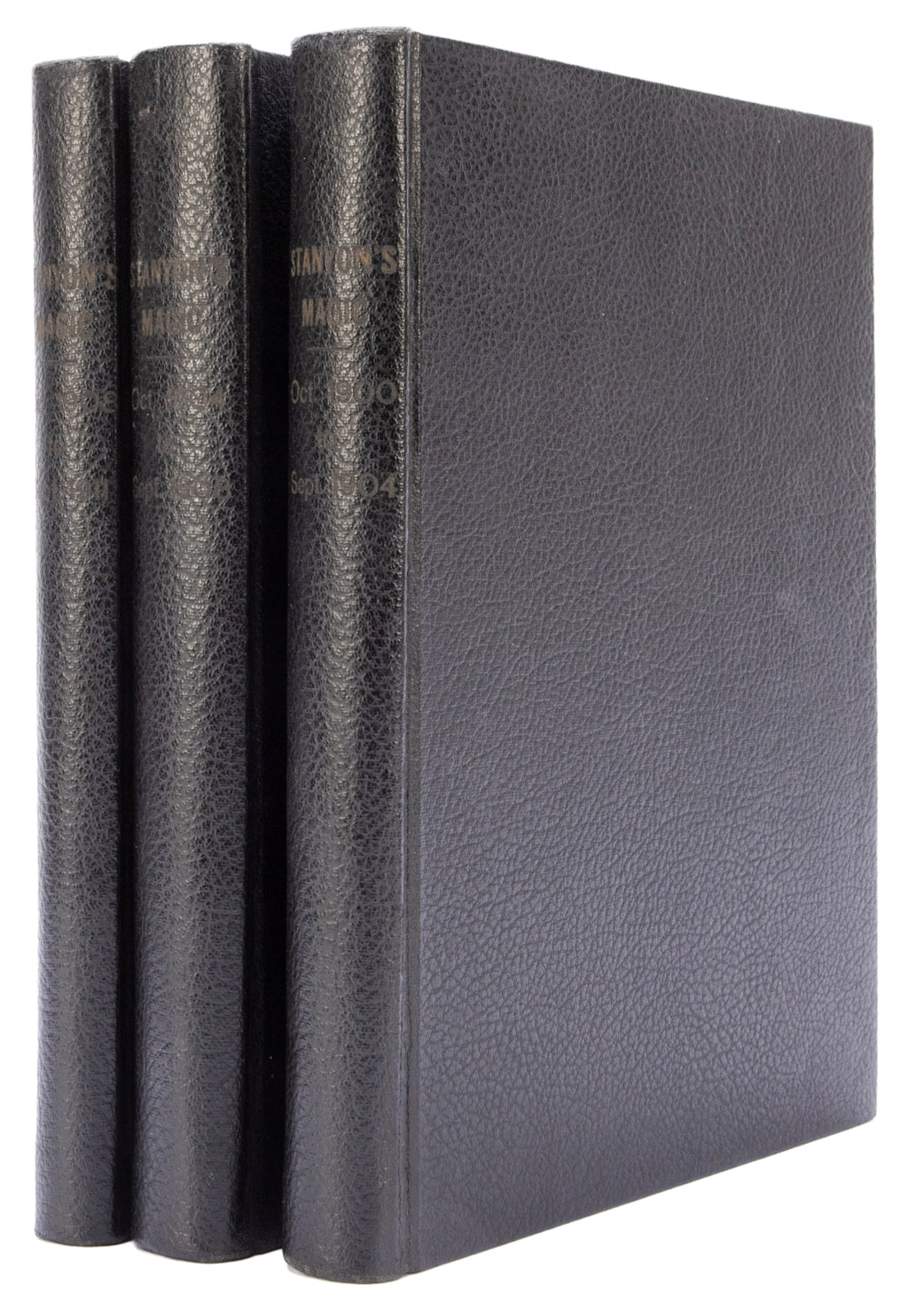 V1 N1 (Oct. 1900) – V11 N12 (Sep. 1911). A complete run in three black cloth volumes with gilt titling on spine. Lacks the final two volumes, published years later by Stanyon, but regardless a valuable resource including tricks, "explanatory programs" of famous magicians from the golden age, and much more. Ex-libris Mike Caveney. Tape marks to Vol. VIII No. 10 and 11, page 7 of Vol. 1 No. 1 detached, mild toning to pages, else in good condition. Alfredson/Daily 3535.