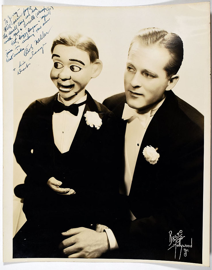 Black and white photograph of ventriloquist Bob Neller with his figure, Dot. Signed and inscribed to Jerry in ink.