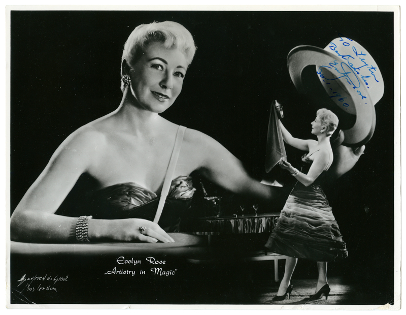 Evelyn Rose, Artistry in Magic. Portrait collage style photograph of Evelyn Rose, signed and dated in the hat. Some edge wear, corners creased. Good condition.