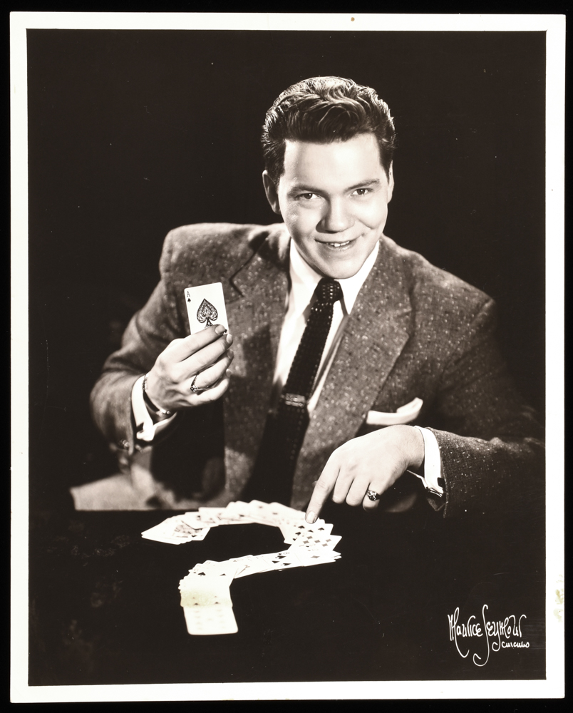 Black and white portrait of Karrell Fox holding up an Ace of Spades. A few spots in margins, adhesive residue on reverse. Stamped on reverse, "Delbridge and Gorrell Orchestras and Entertainment."