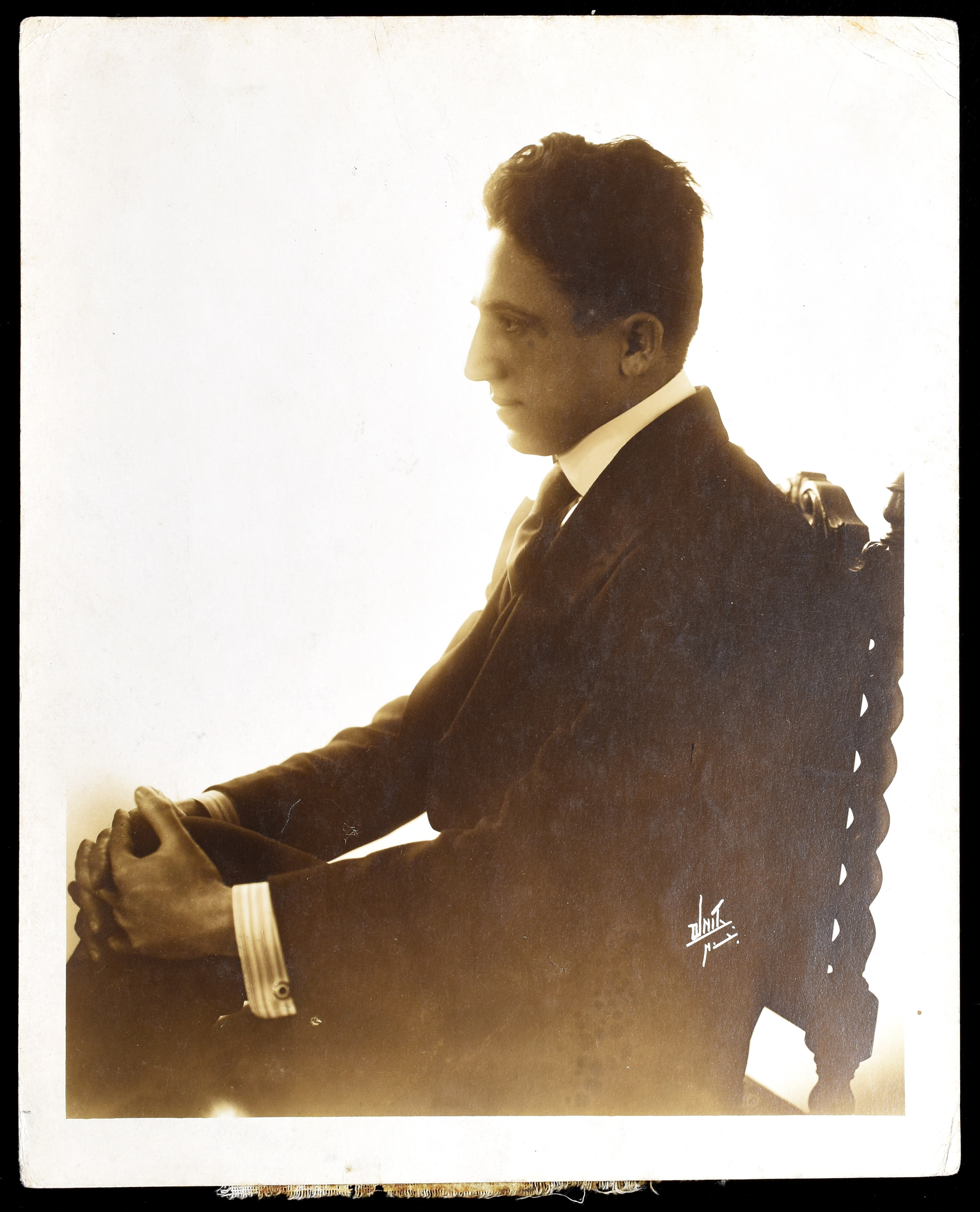 Identified on reverse as "Marcon, comedy in shadows," this portrait features a pensive performer in silhouette profile. General wear and soiling. Fair.