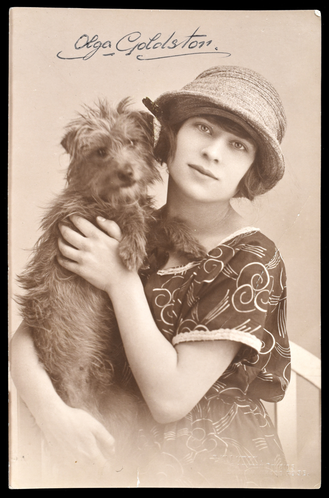 Real photo postcard of Olga (signed "Goldston," however her last name was not Goldston) posing with a dog. Creasing and toning. Very good.