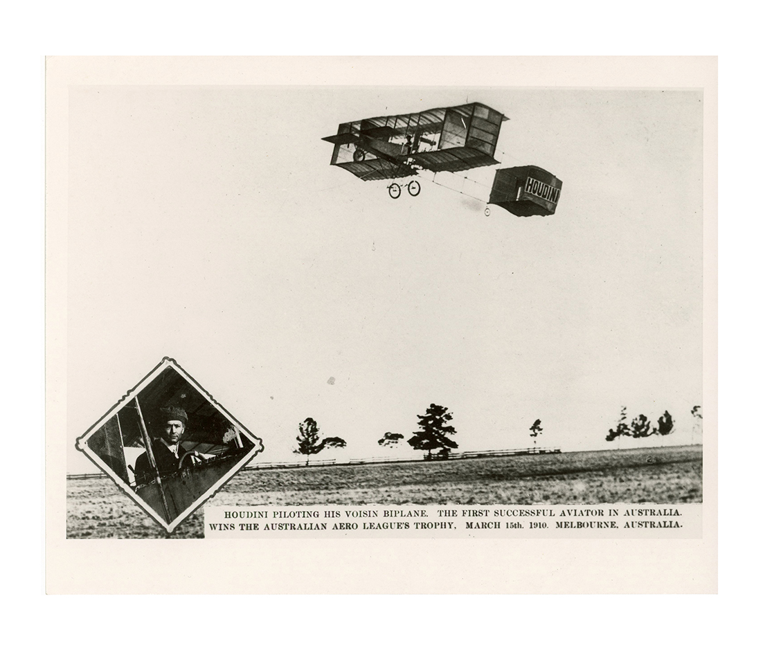 Collection of eighteen reprint photographs of Houdini including one image depicting the magician piloting his Voisin biplane. Some duplication. Very good condition.