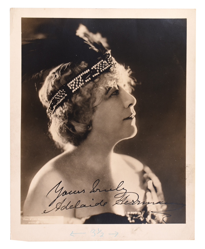 Signed pre-print by Adelaide Herrmann, this silver gelatin print portrait shows her in a stage costume with dramatic lighting. Smudges in bottom and right margins, blue pencil in bottom margin, a few small marginal creases and tears.