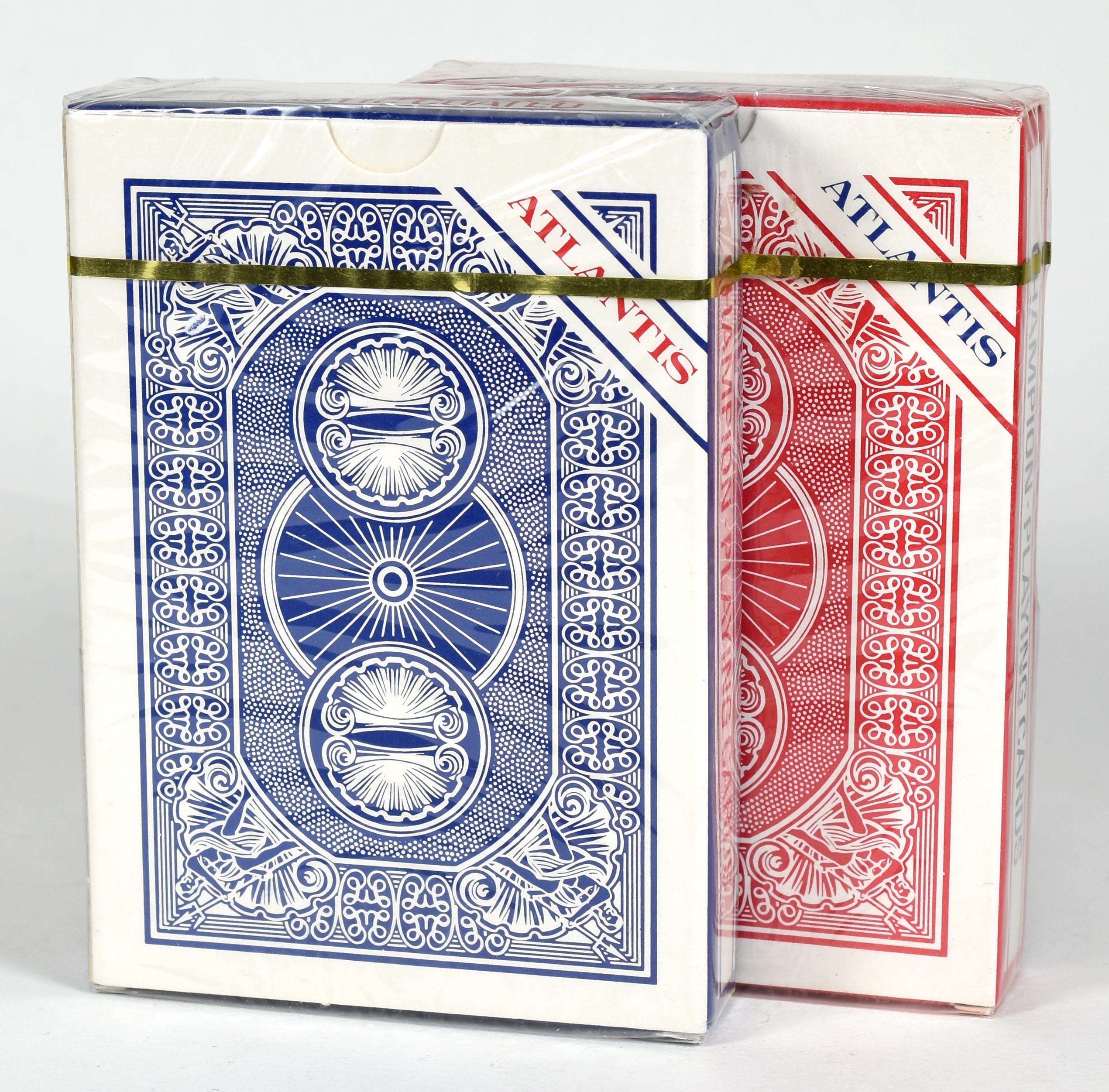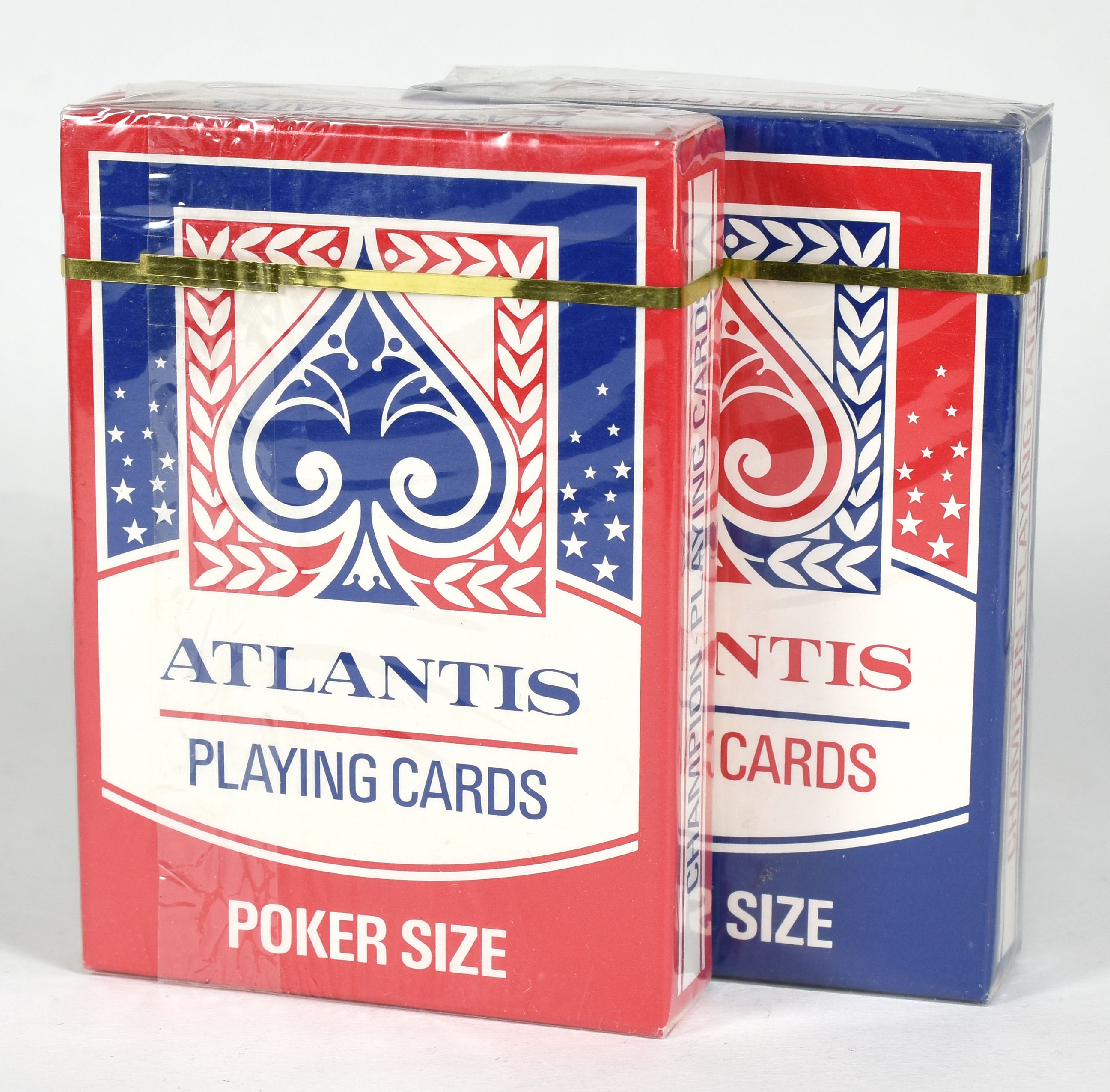 Two decks, red and blue, of Atlantis Champion Playing Cards, Poker Size. In original sealed plastic wrapping. A few small tears to plastic wrapping, else in mint condition.