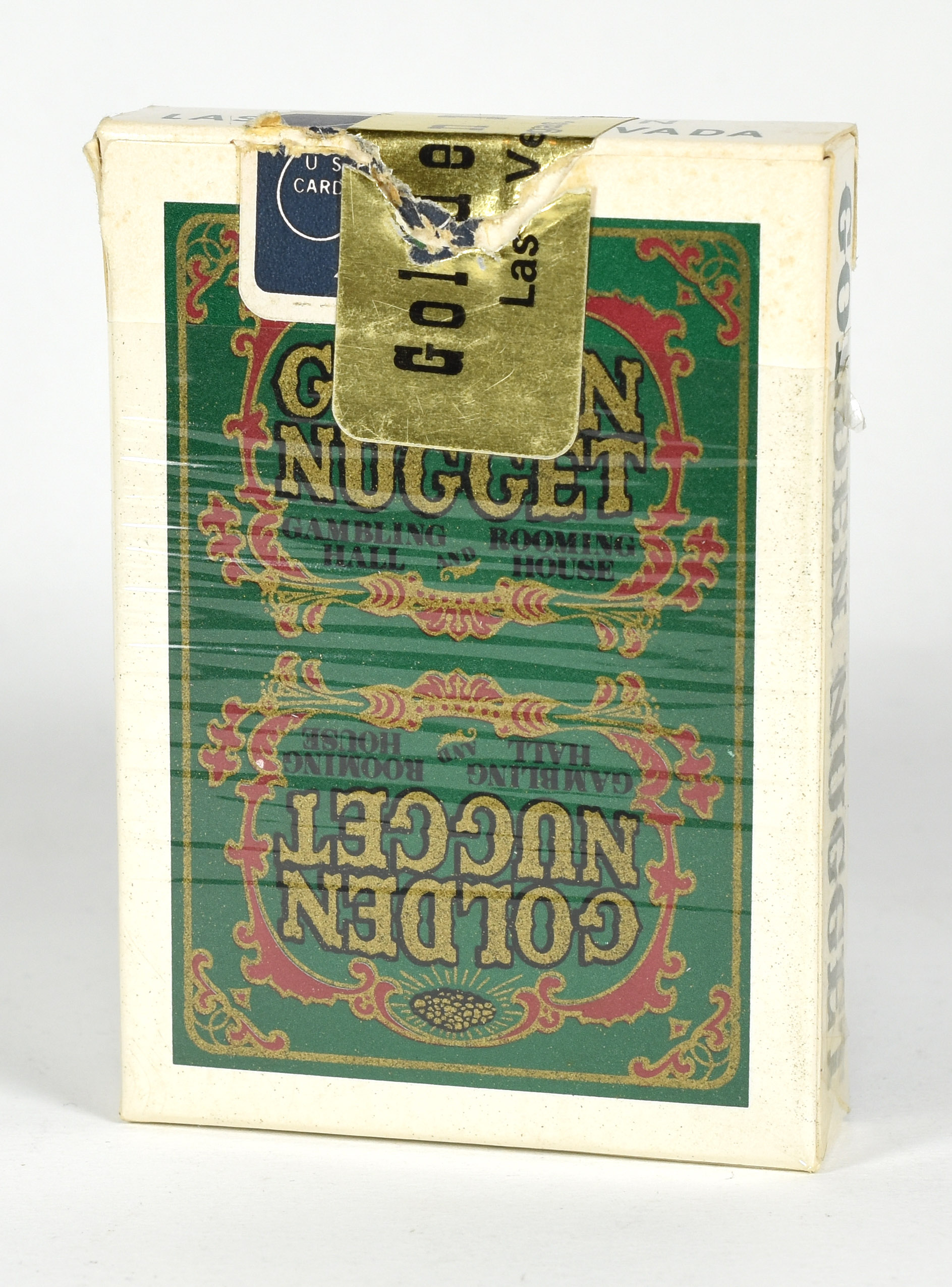 Deck of Golden Nugget playing cards in the original box with partial plastic wrap and opened seals, blue USPCC seal and gold casino seal. Cards blackened on one edge. Mild wear to both box and cards. Very good condition. 52 + J + OB.