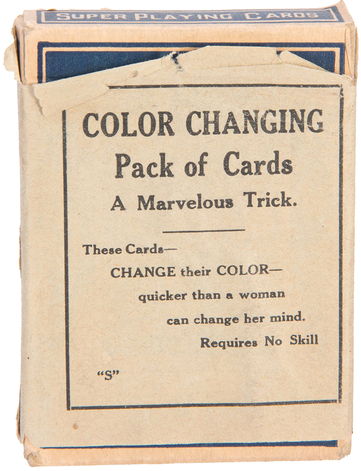 A complete pack of cards is shown – backs red, all red, bright red. Presto – the backs suddenly change to a blue color. Includes instructions. Toning, wear, else in good condition.