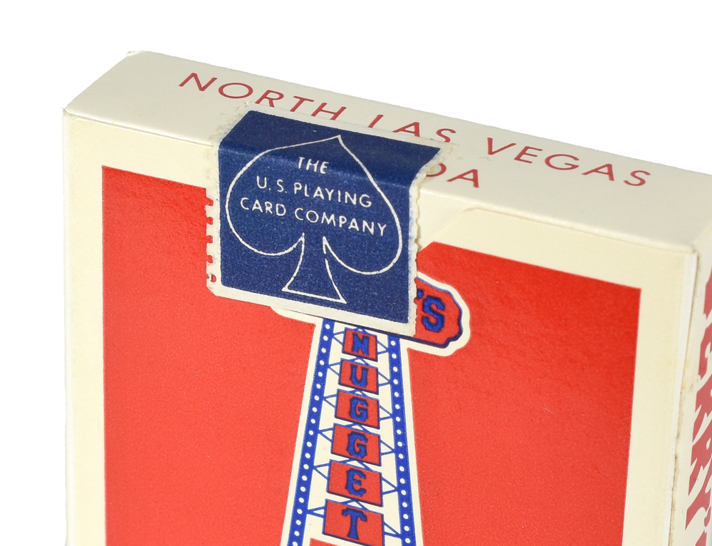 A sealed deck of Jerry's Nugget playing cards, red back with USPCC blue seal still intact. Cellophane wrapper not present, but the box is in near mint condition with just a few light smudges and a few corners lightly bumped. Deck presumed mint.