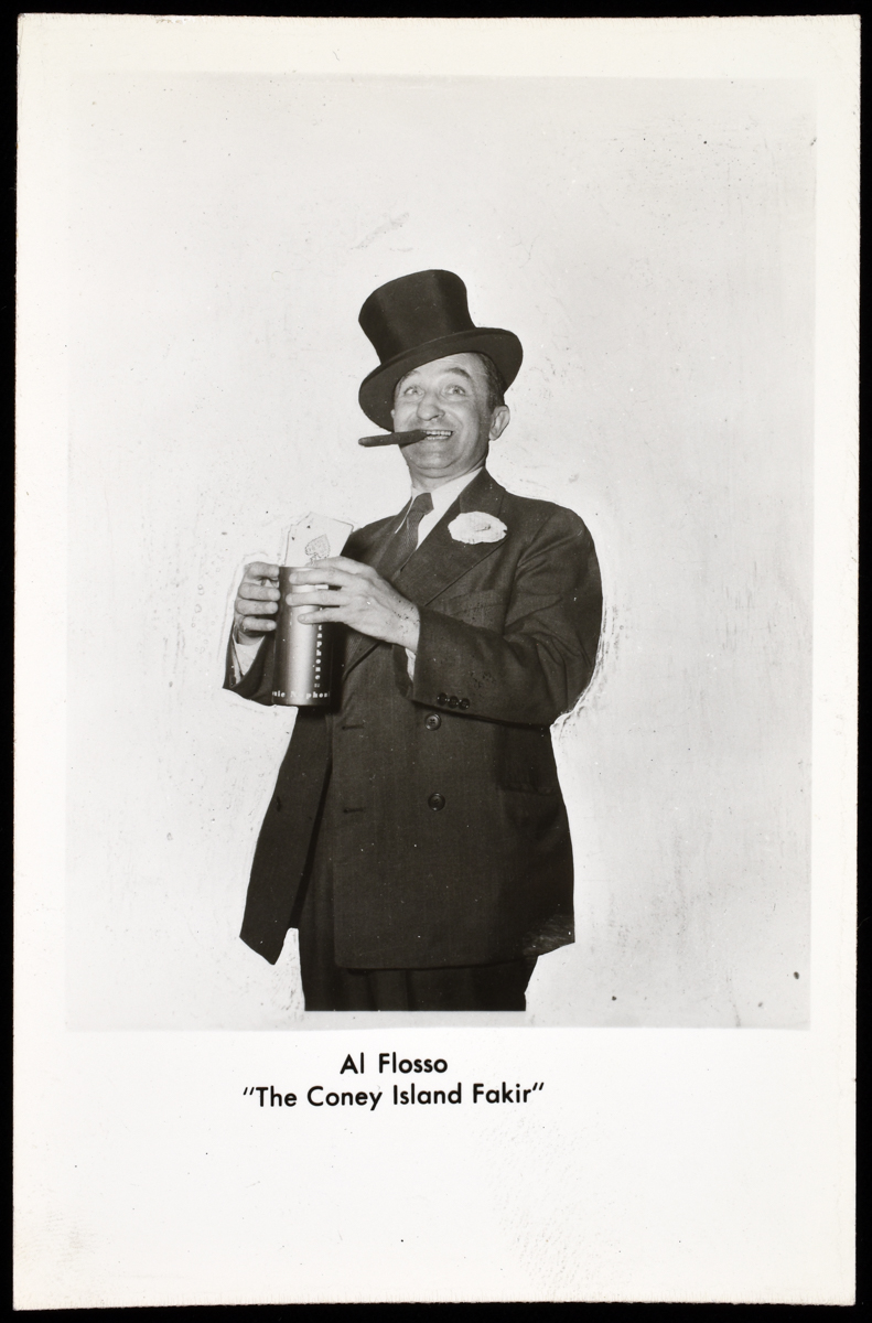 Real photo postcard of "The Coney Island Fakir" performing a card trick. Unused, reverse generally smudged and discolored, light wear to front. Good condition.