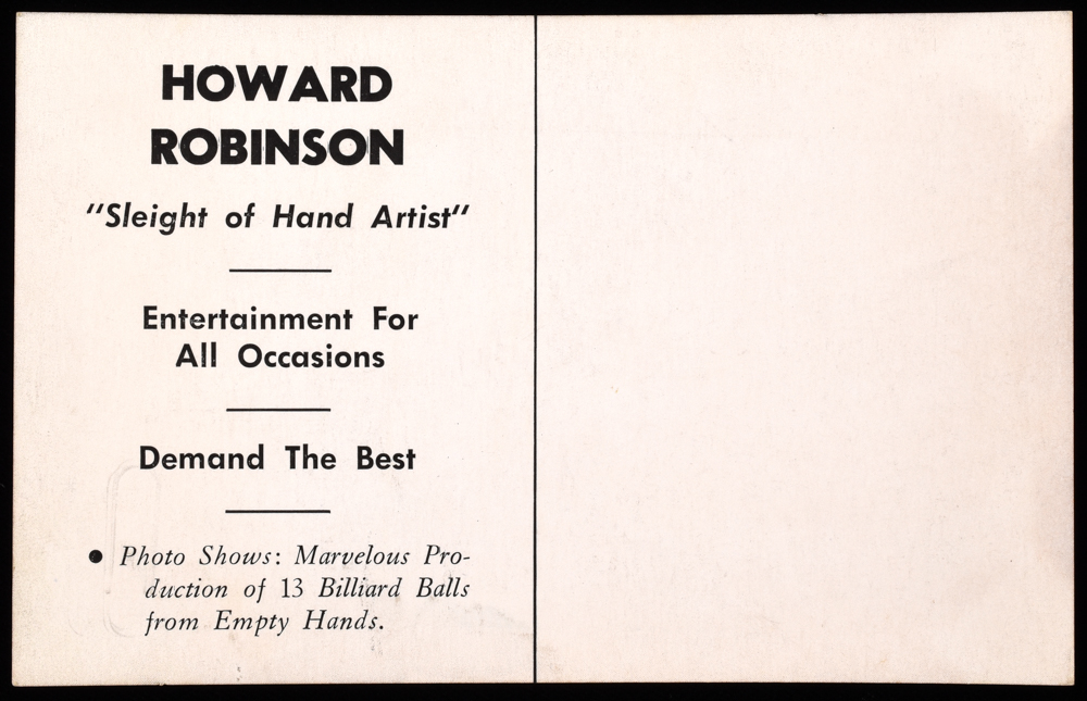 Postcard advertising Howard Robinson "Sleight of Hand Artist". Minor curling. Very good.