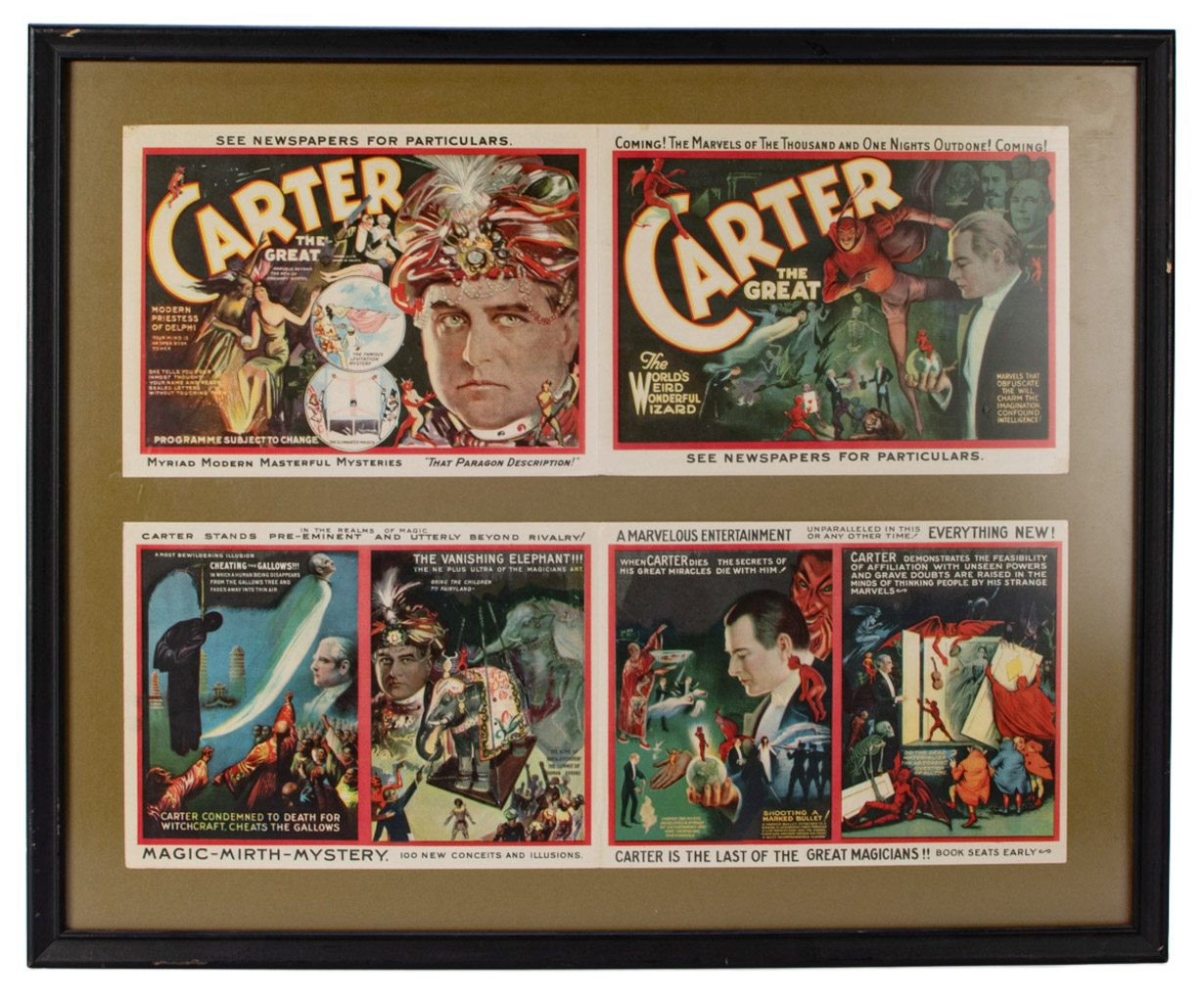Set of two Carter the Great Lithograph advertisements, framed and ready to hang. Lithographed by Otis, the same firm that printed his fantastic posters so popular with magicians. Small chips to the frame. B.