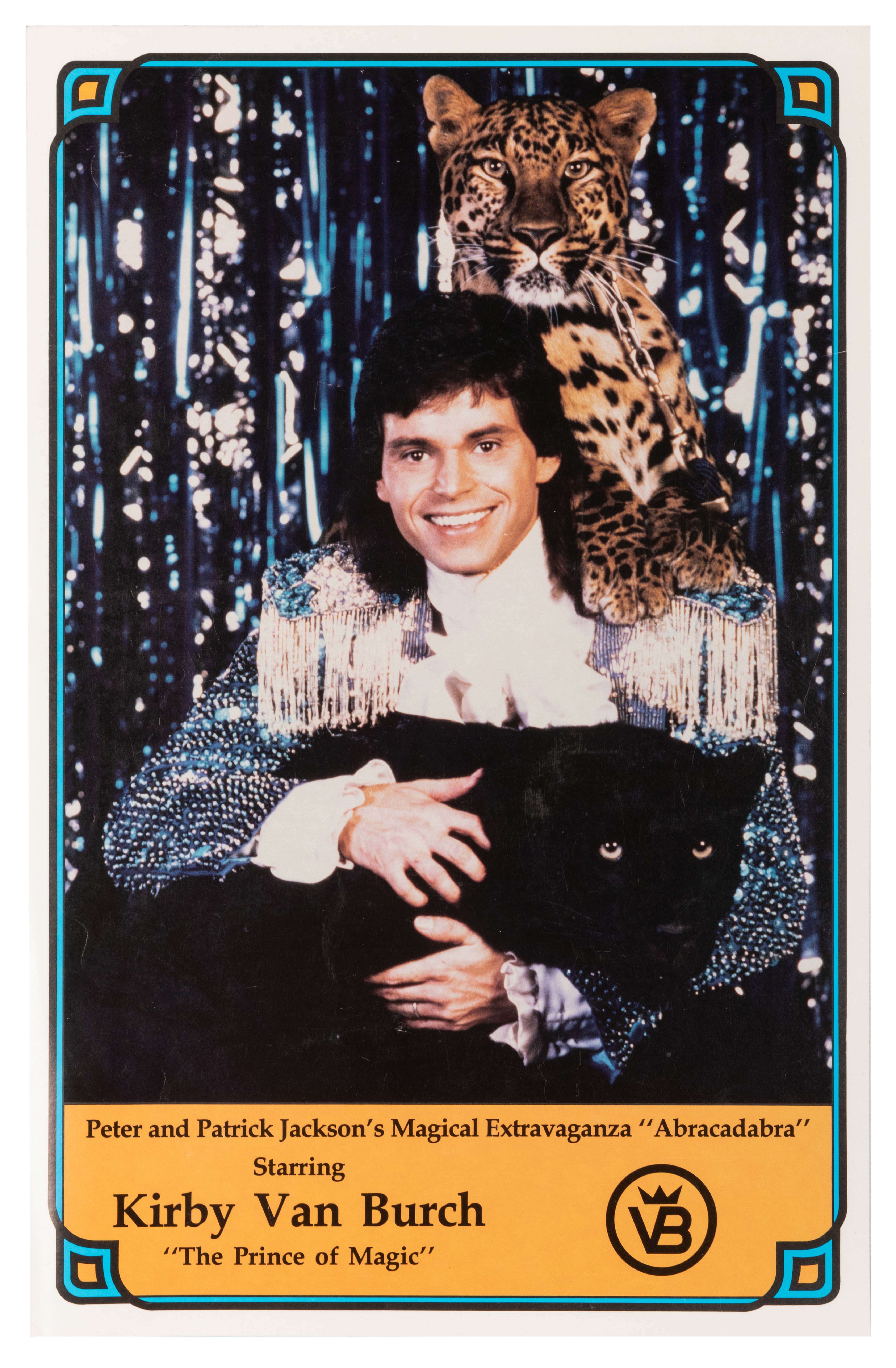 Peter and Patrick Jackson's Magical Extravaganza, "Abracadabra," Starring Kirby Van Burch, The Prince of Magic. Full color portrait poster of the performer and two leapords (or jaguars). Linen backed. A.