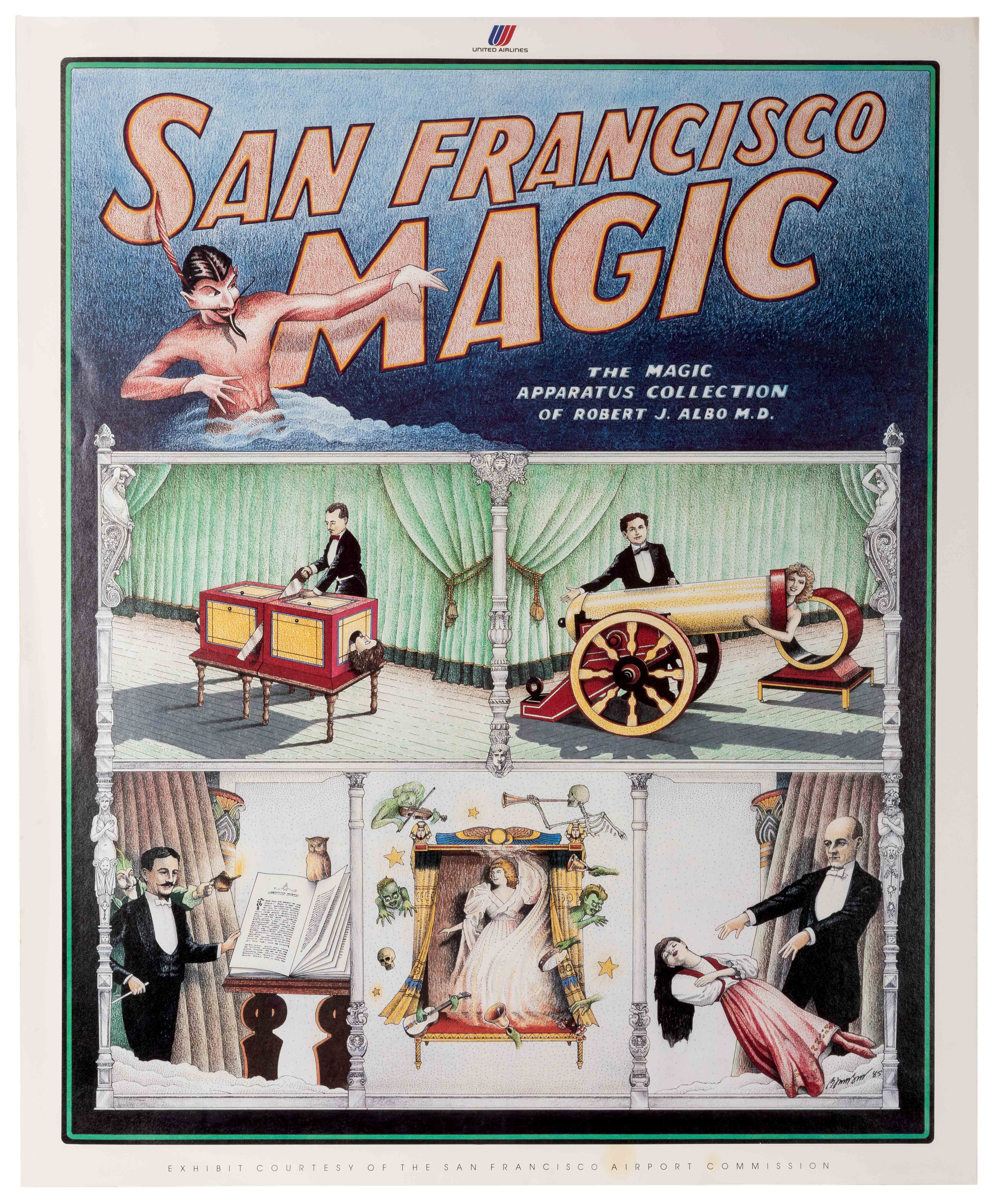 Full color poster for an exhibit at the San Francisco Airport for The Magic Apparatus Collection of Robert J. Albo and curated by Richard Fong. Illustrated magic scenes. Unmounted, some mild creasing, a few spots to bottom edge. A-.