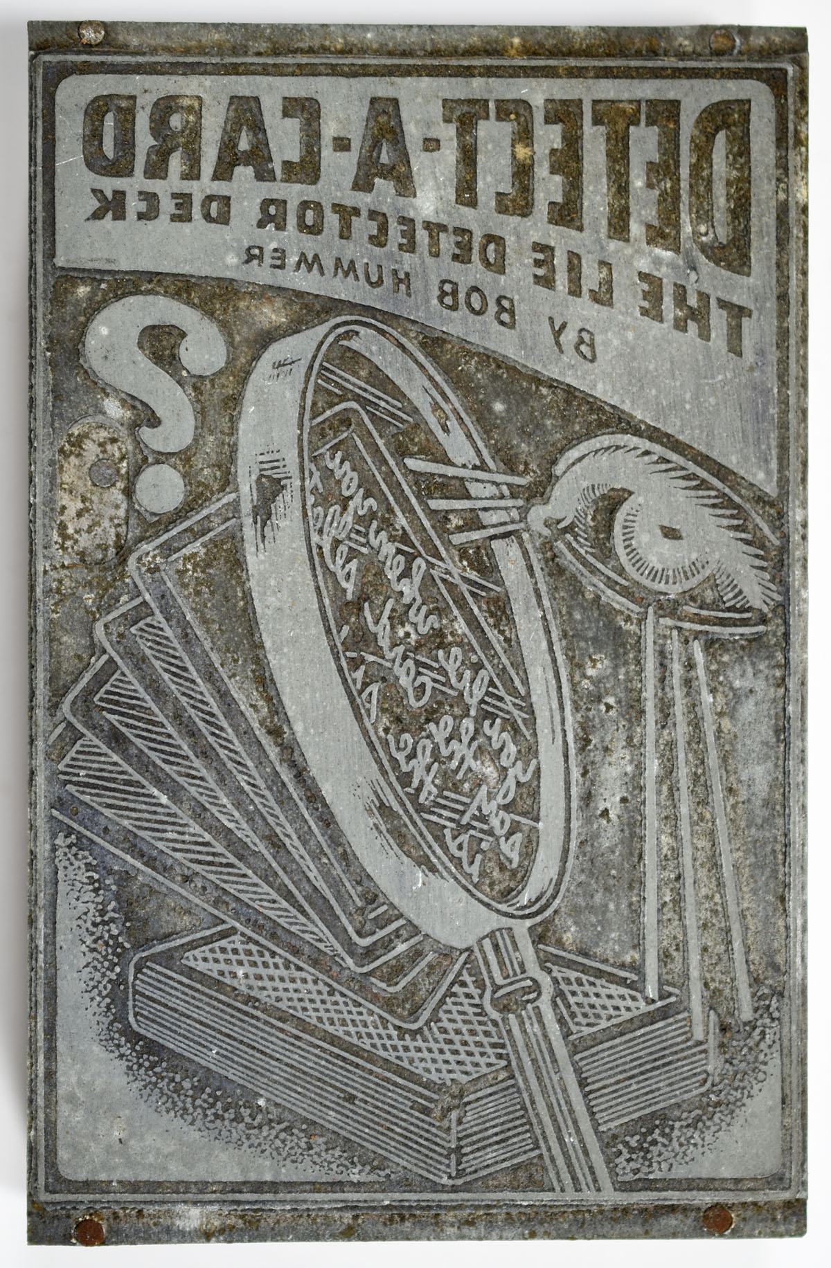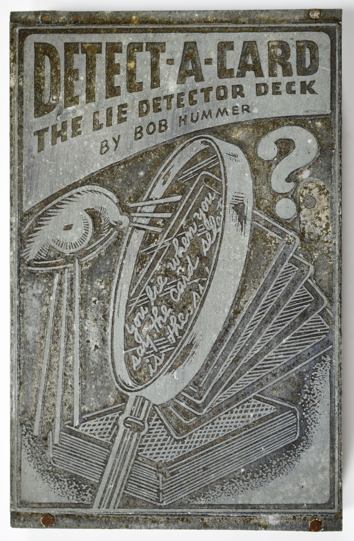 Vintage metal printing block backed with wood. For the Detect-A-Card trick, "The Lie Detector Deck," by Bob Hummer.
