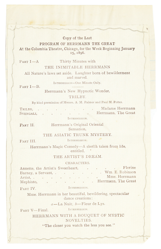 Copy of the last program of Herrmann The Great at the Columbia Theatre in Chicago. Pencil markings, program glued onto another piece of paper, stamp on the back, fair condition.