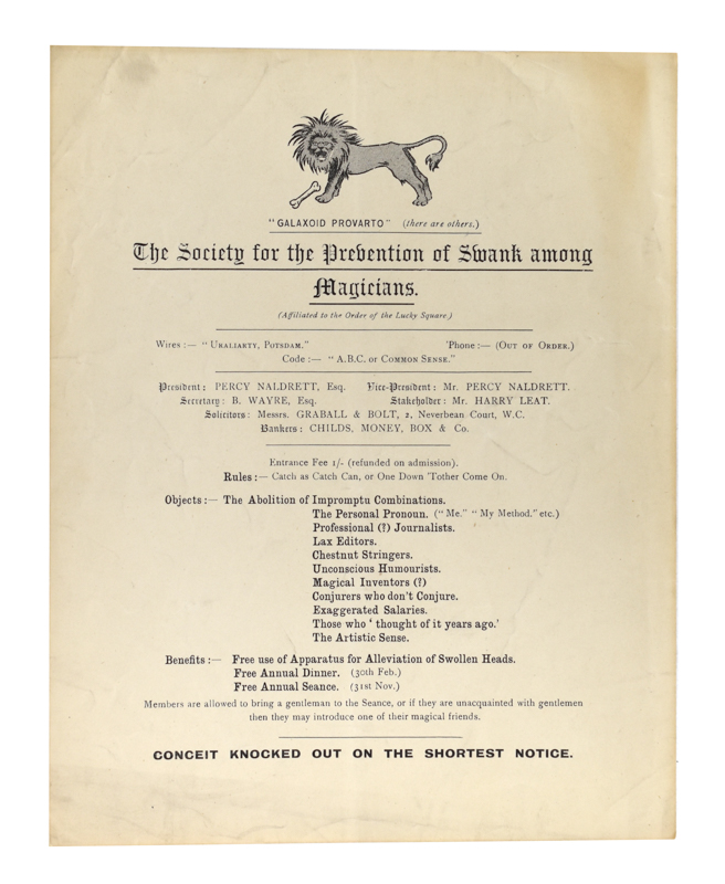 A humor program by Percy Naldrett and Harry Leat titled "The Society for the Prevention of Swank among Magicians." Some soiling and wear, else in good condition.
