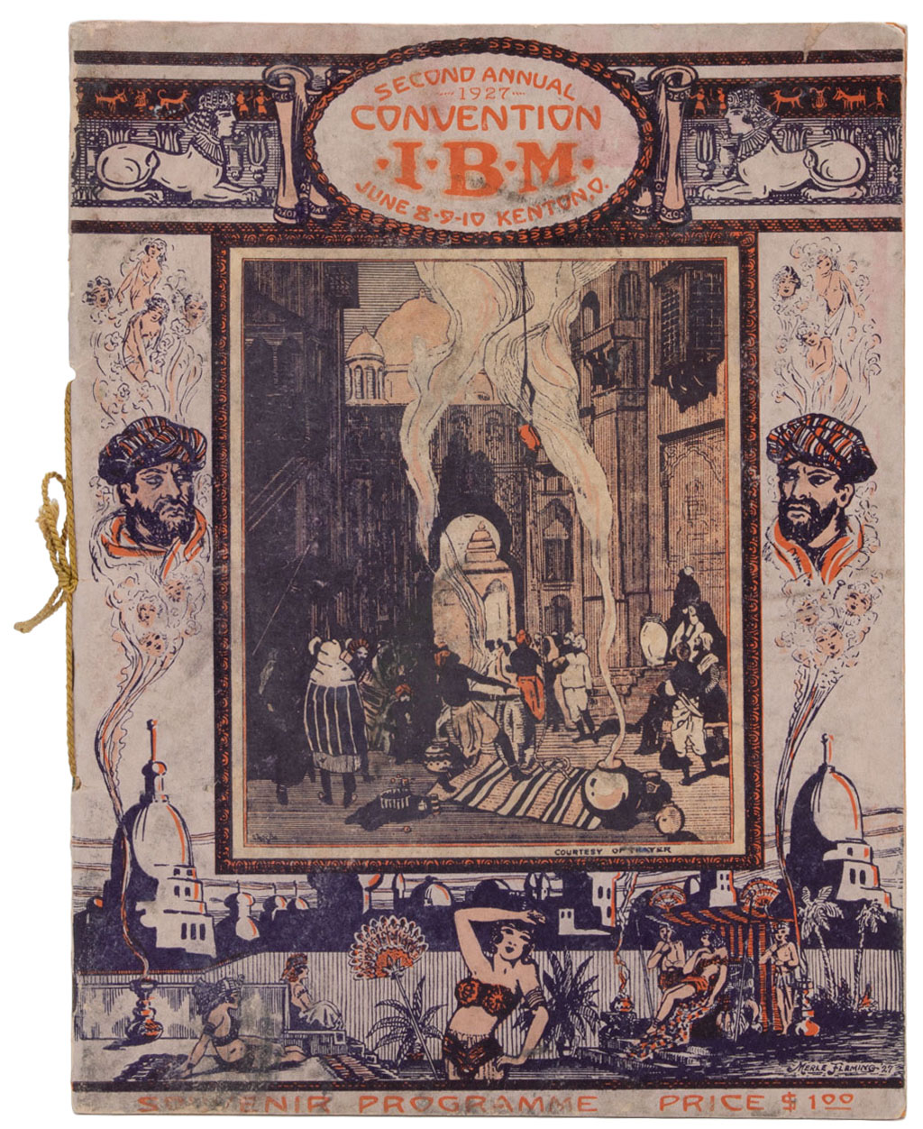 Souvenir program for Second Annual I. B. M. Convention in 1927. Oversized color wraps, bound with string. Profusely illustrated with photographs. Mild toning and water damage, fair condition.
