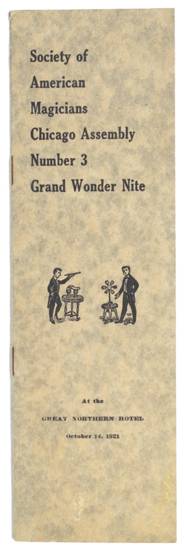 Program for Society of American Magicians Chicago Assembly Number 3 Grand Wonder Nite at the Great Northern Hotel in Chicago. Menu includes Shrimp "Felsman", Boiled White Fish "Goldin" and so on. Very good condition.
