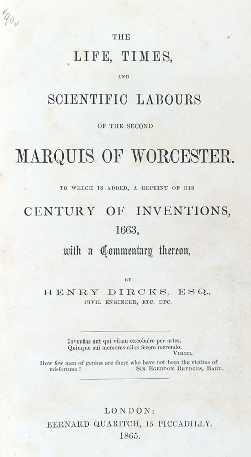 The Life, Times, and Scientific Labours of the Second Marquis of Worcester. Quarter bound in brown cloth with tan paper sides. Marbled edges, engraved frontispiece, foldout.