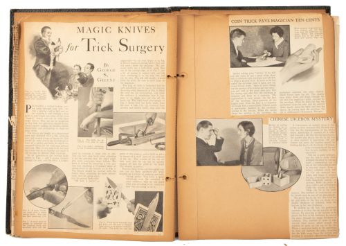 Scrapbook containing clipped photographs of Blackstone, Dunninger, Homar, Caesar, articles regarding close-ups, illusion/stage magic from magazines and papers, instructions for Kenard’s Nu-Die Mystery, Adams’ tricks, The Chinese Bottle Mystery and a few other tricks. Toning, pages detached, Fair condition.